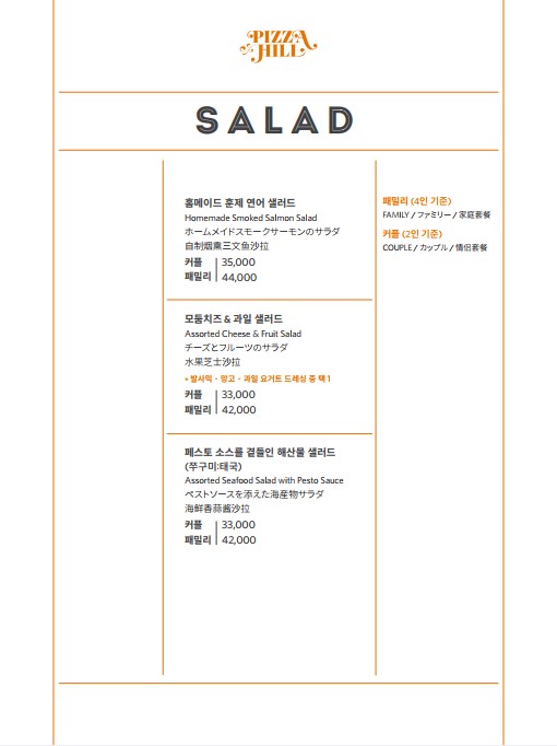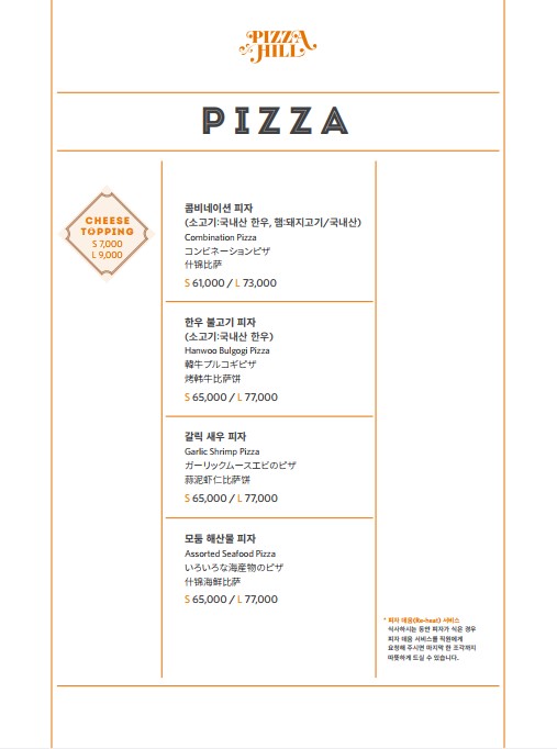 피자힐에서 여러 메뉴들을 먹어봤지만 여기는 피자가 단연 맛있다. 파스타류는 가격 대비 만족감을 느끼지 못했다. 그런데 피자는 언제나 맛있게 먹었다. 우리는 4가지 맛을 다 느낄 수 있는 콰트로 피자를 시켰다(가격 95000원).