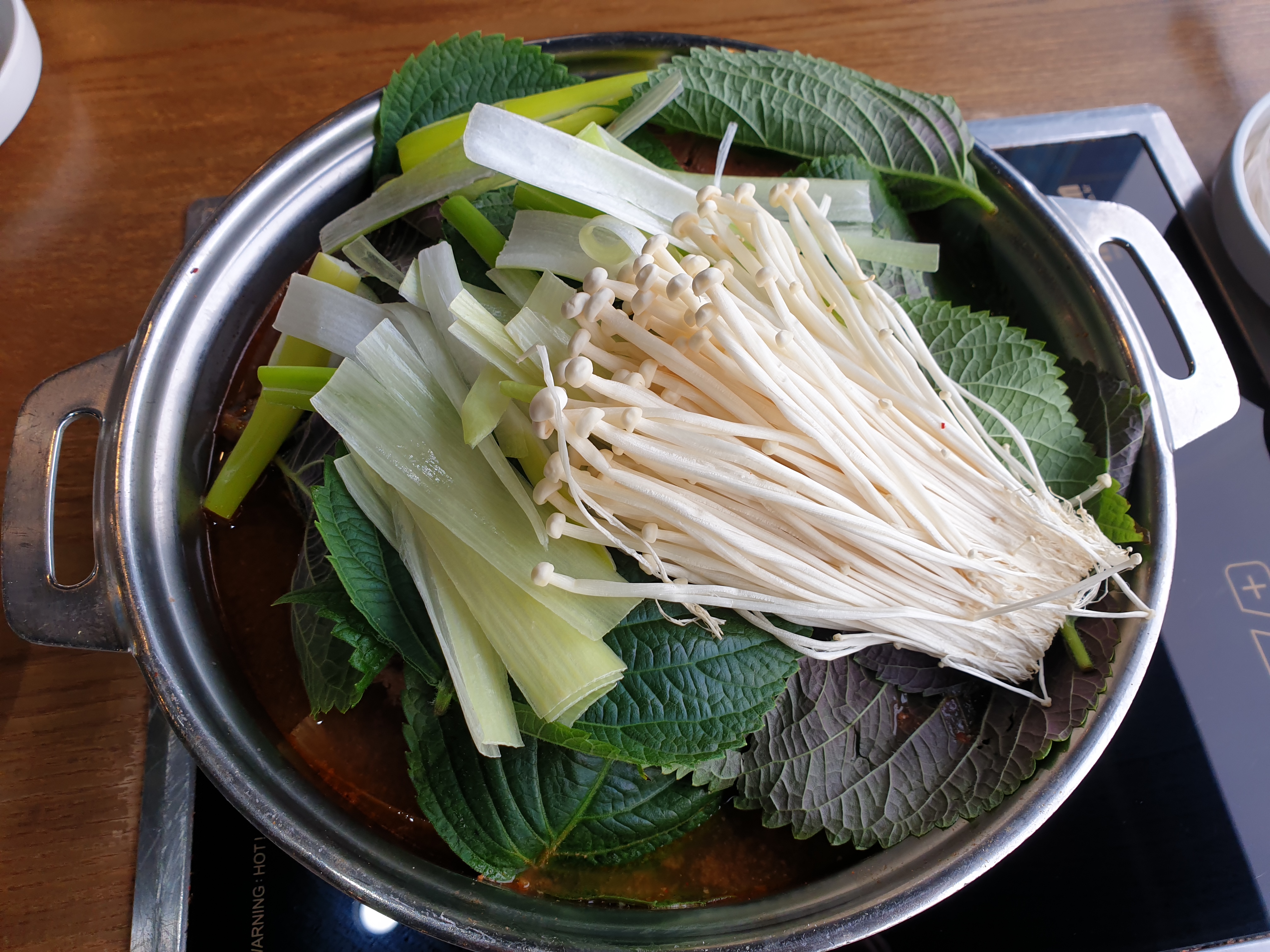 팽이버섯, 깻잎 아래 감자 등뼈와 시래기가 있습니다. 위에 있는 야채만 익으면 먹을 수 있게 미리 끓여서 나옵니다. 아침에한가해서 주문하자마자 감자탕이 나왔습니다. 점심때나 저녁에는 손님이 많아서 기다려야 하지만 주문한 음식은 바로 나오는 편입니다.