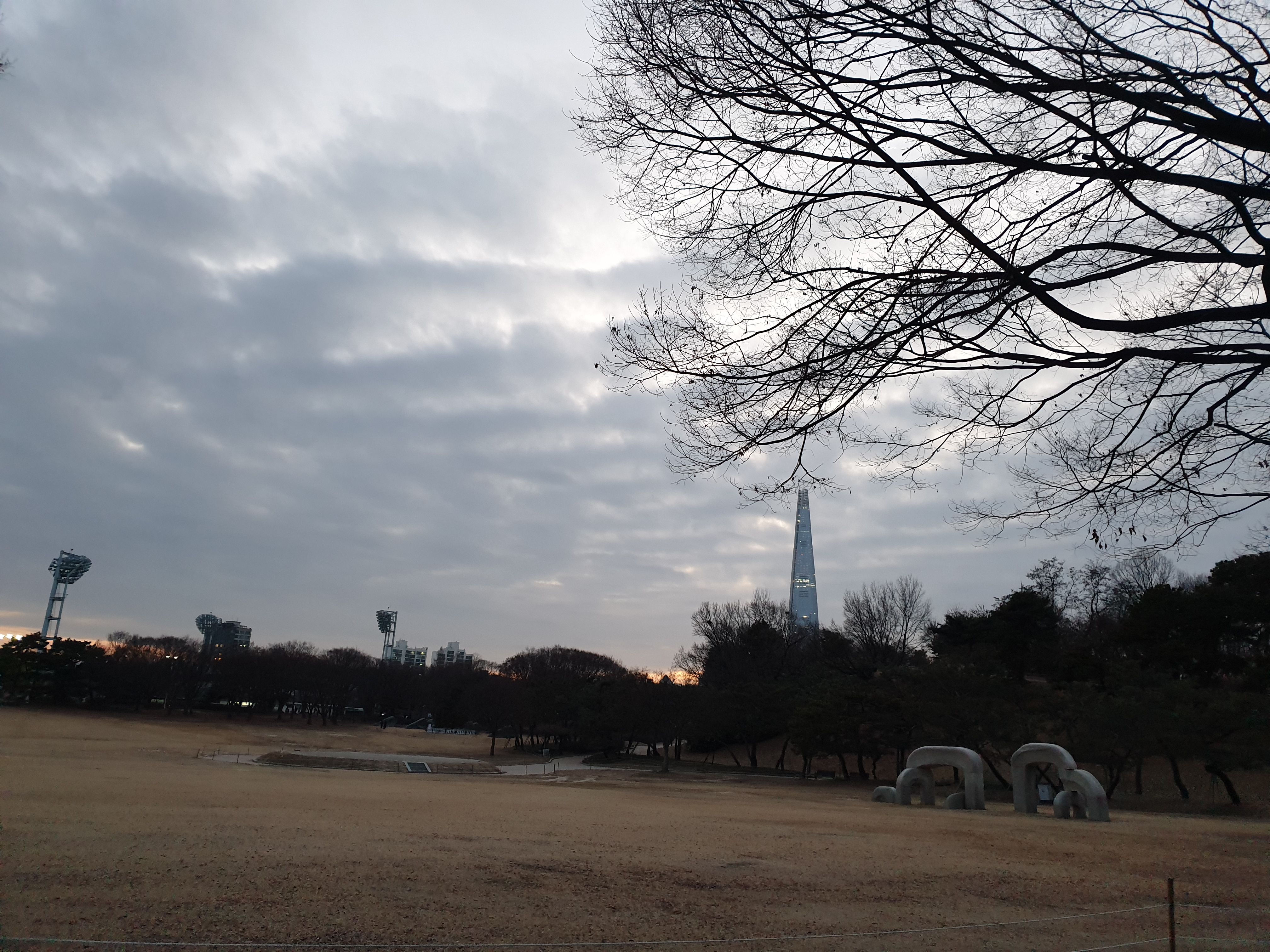 몽촌토성을 돌다 보면 평화의 문, 몽촌호, 롯데월드타워가 한눈에 펼쳐지는 장소가 있습니다. 대나무와 어우러져 장관을 이룹니다.