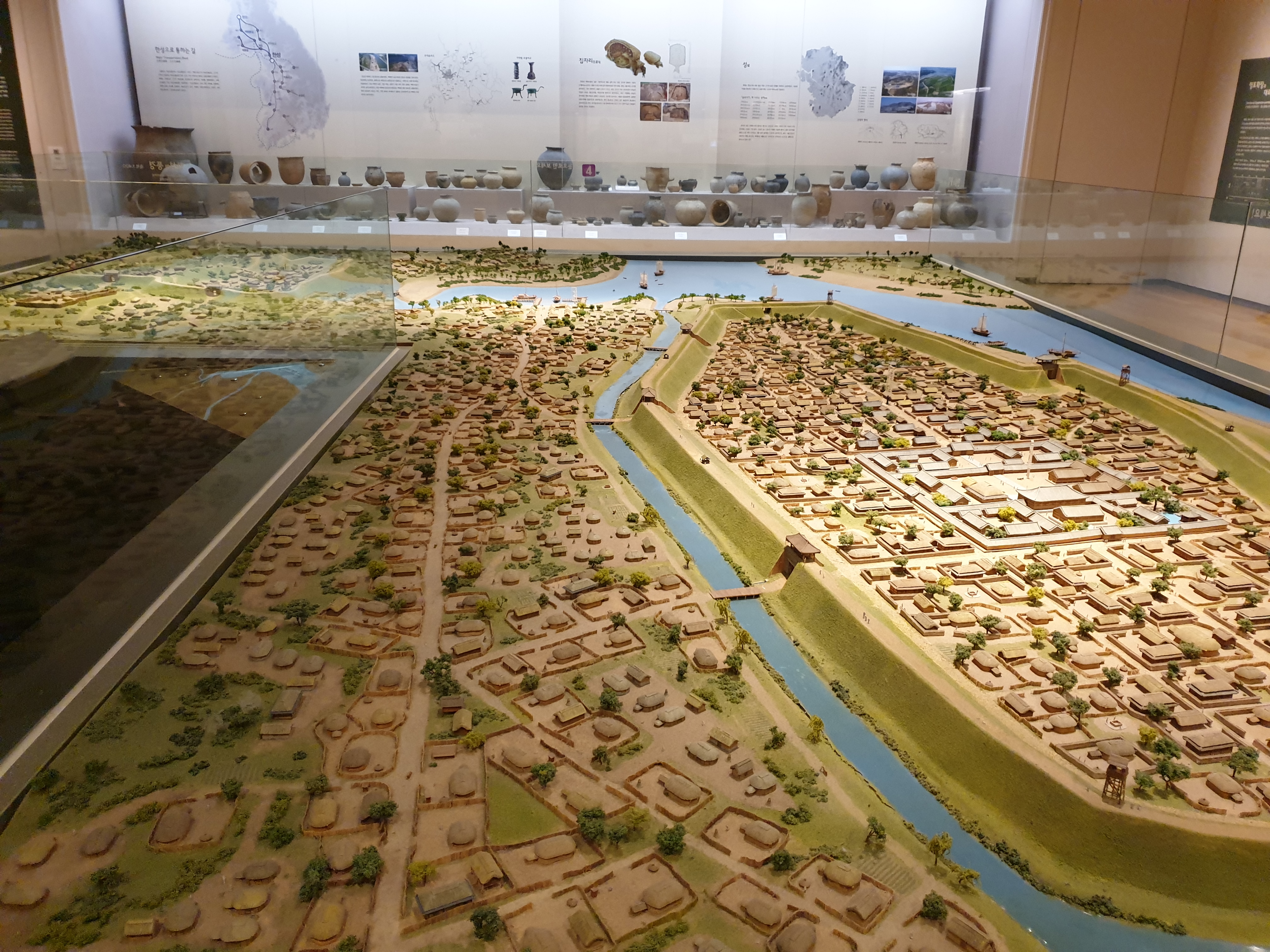 한강변에 나라를 세운 백제의 도시 모습을 재현한 것입니다. 백제 왕도 한성은 한강변에 위치하기에 배를 타고 바다로 나가 중국대륙, 일본 열도와 활발하게 교역을 할 수 있었습니다.