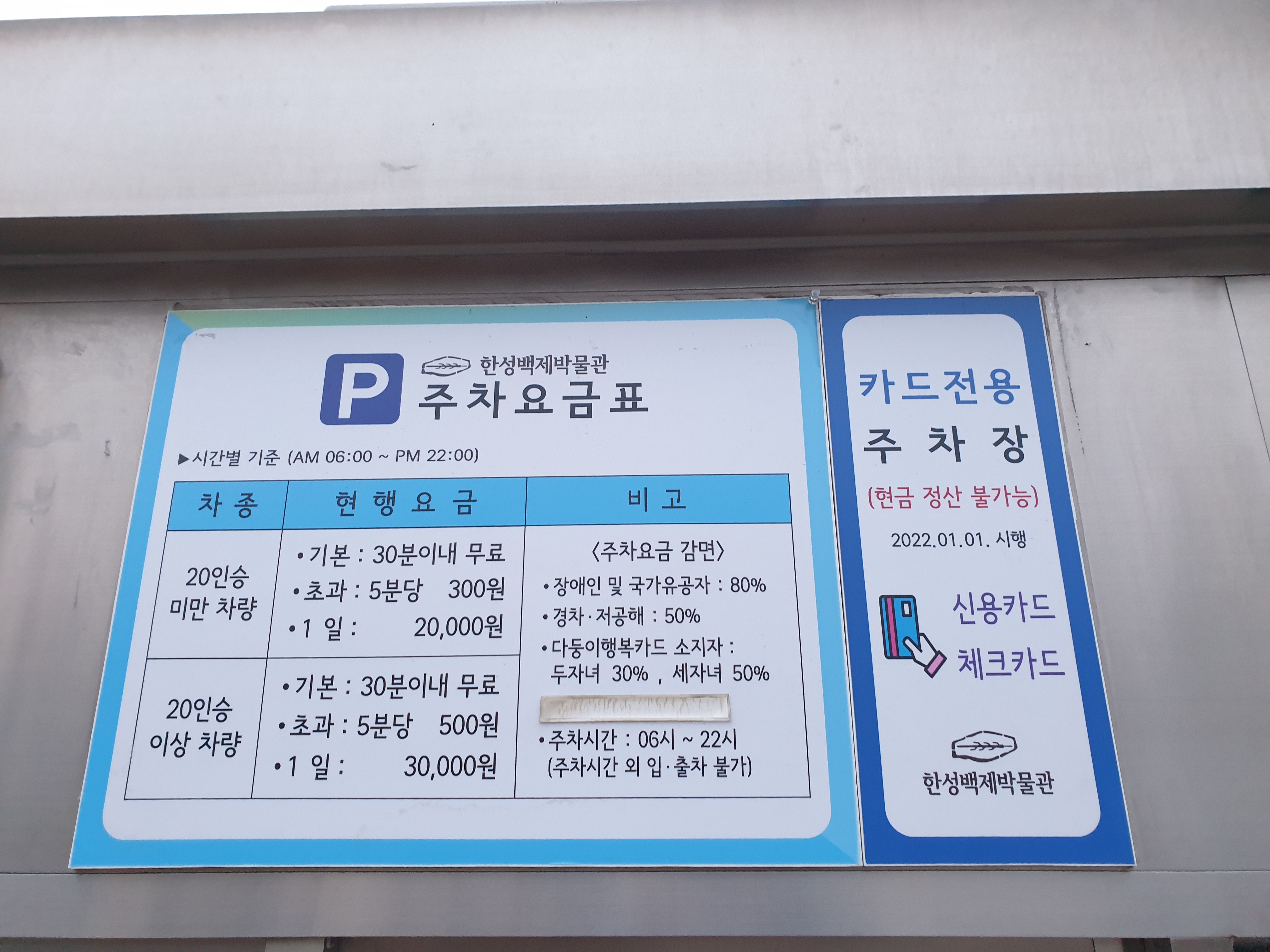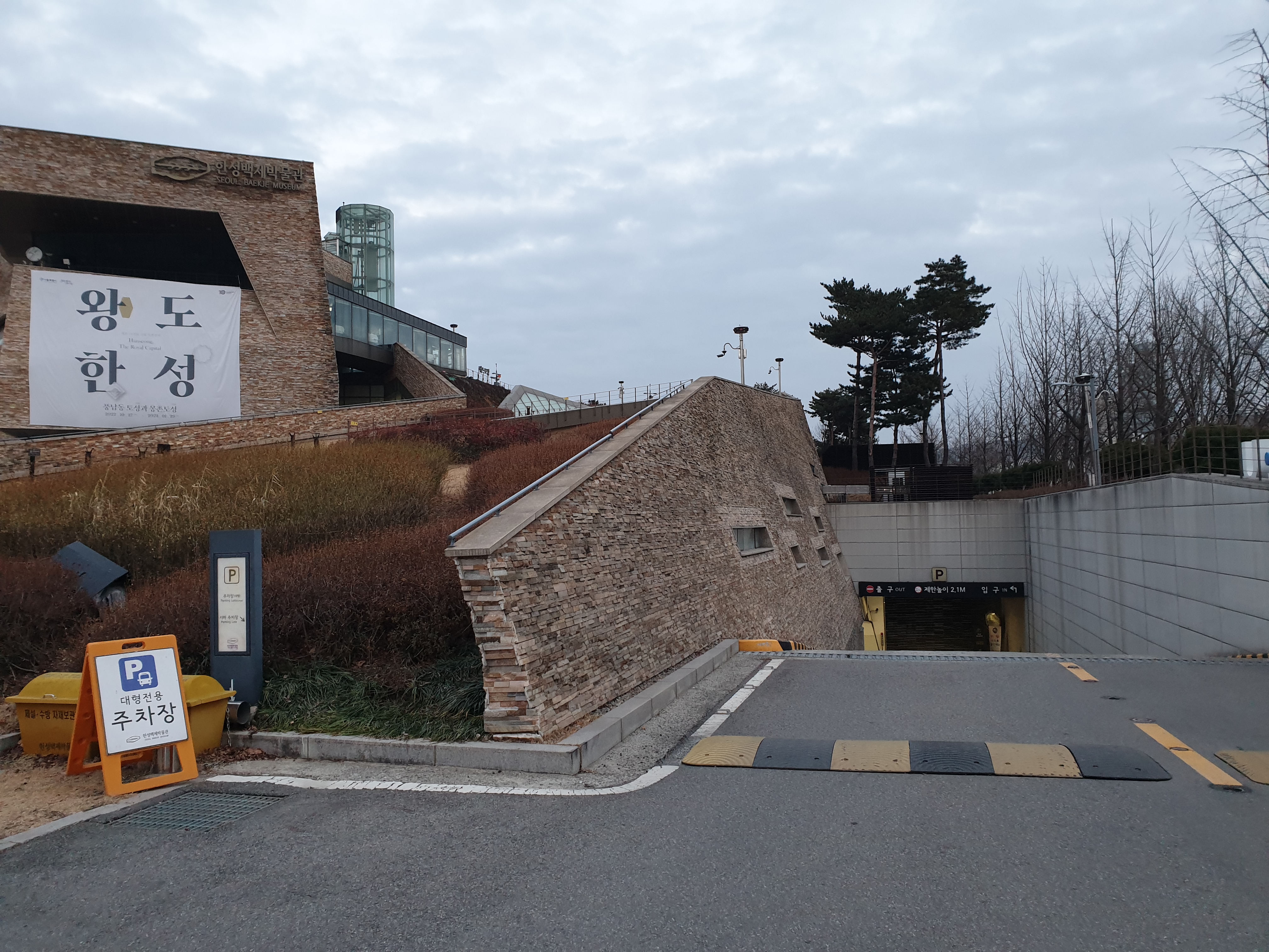 한성백제박물관 주차장 입구입니다. 지하까지 있어 주차공간은 넉넉해 보입니다. 주차요금은 승용차의 경우 기본 30분 무료이고 초과 5분당 300원입니다.