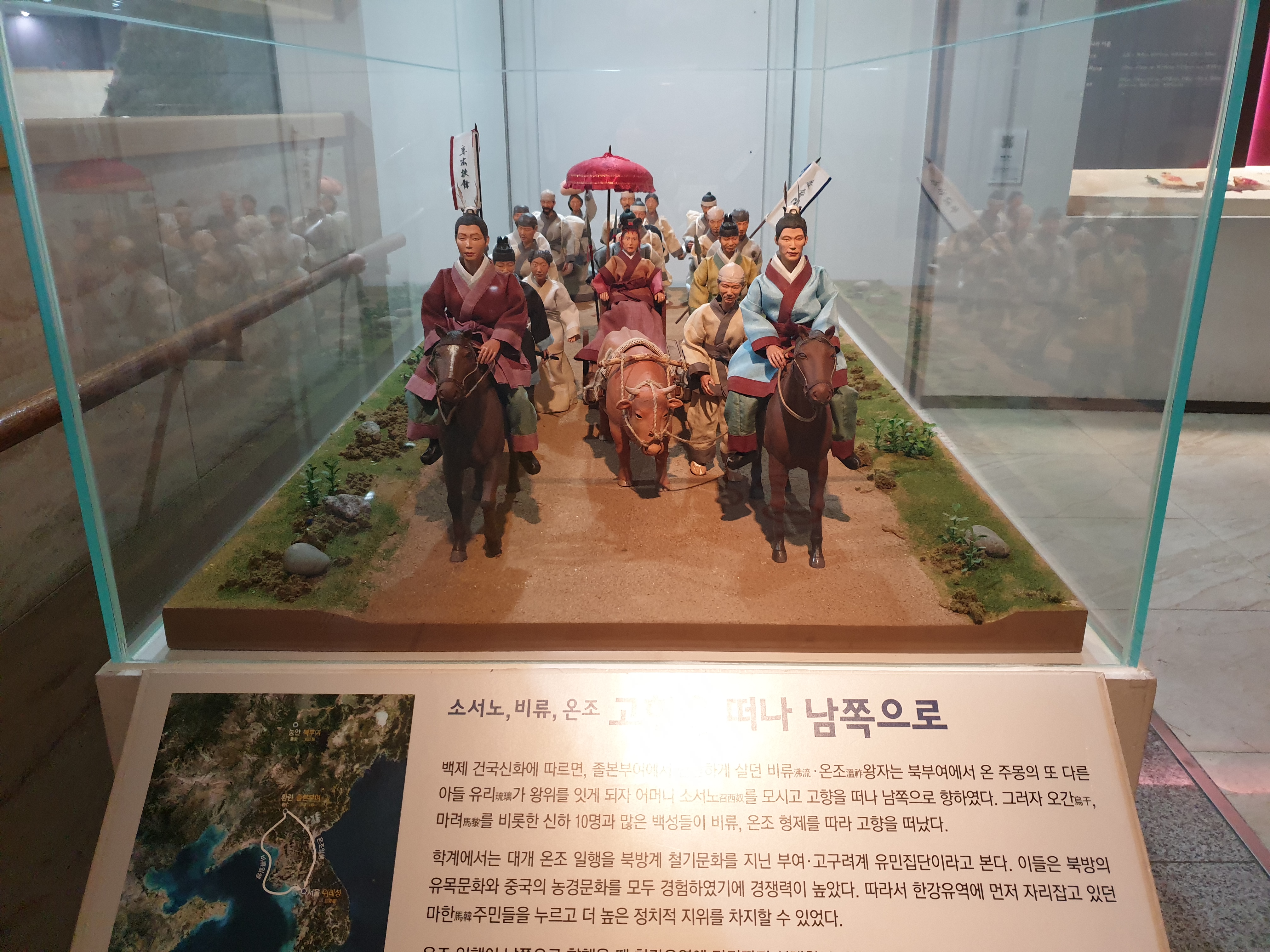 박물관에는 도자기 조각을 맞춰 완성하는 체험코너가 있어 아이들이 좋아할 것 같습니다. 온조가 백제를 세우기 위해 사람들을 이끌고 남쪽으로 내려오는 모습입니다.