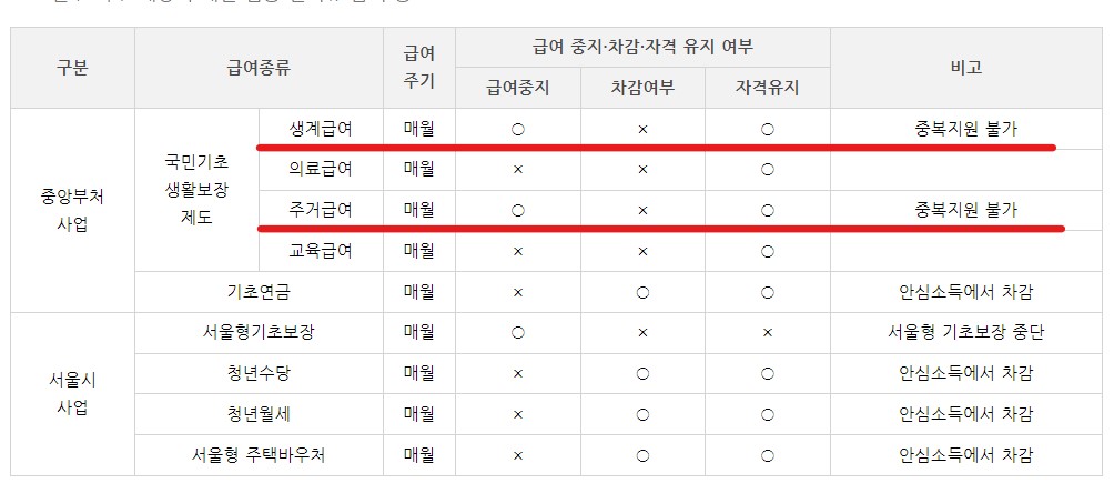 현행 복지제도에서 현금성 급여를 받고 있다면 중복 지급이 불가합니다.