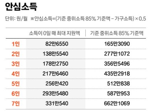 | 1인 가구→176만 원, 2인 가구→293만 원, 3인 가구→376만 원, 4인 가구→459만 원, 5인 가구→538만 원 |