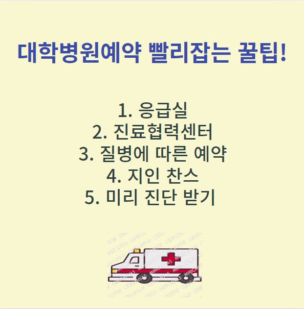 가족이나 지인들 중 큰 병이 생기면 대학병원을 찾게 됩니다. 일반 병원도 진료환자가 많아 하루 종일 기다리게 되는데 대학병원 대기 시간은 깁니다. 특히, 해당 분야 명의에게 진료를 받기 위해서는 몇 달을 기다리기도 합니다. 질병이 심각하기 때문에 대학병원을 가려고 하다가 병을 더 키울 것 같은 상황이 되는데요. 대학병원 예약을 빨리 잡을 수 있는 꿀팁에 대해 알아보겠습니다.