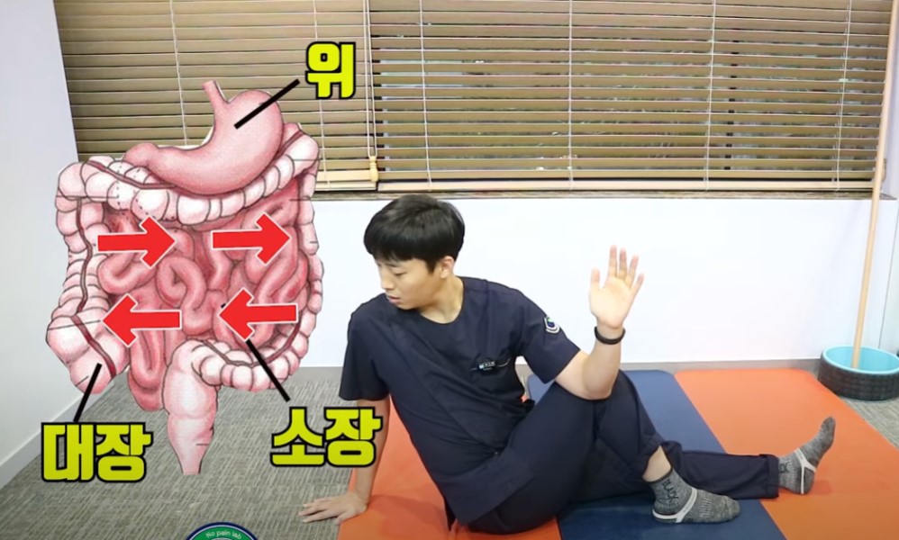 이 동작을 좌, 우로 반복해 줍니다. 이렇게 하면 장들을 쪼았다가 풀었다가 하는 효과가 있어 장운동이 활발해집니다.