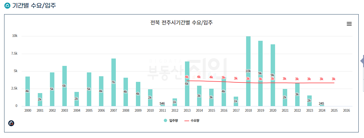 광주광역시 수급현황입니다. 2022년도 급격한 공급량으로 힘들었던 시장이 2023년부터는 공급세대수가 줄어들고 있습니다. 2025년부터는 수요대비 공급이 절대적으로 부족하네요. 이곳도 전주시와 같은 흐름을 보일 것으로 보입니다. 전세가가 반등하는 시기를 보면서 매수시기를 결정하면 안전한 투자처가 될 수 있을 것으로 보입니다.