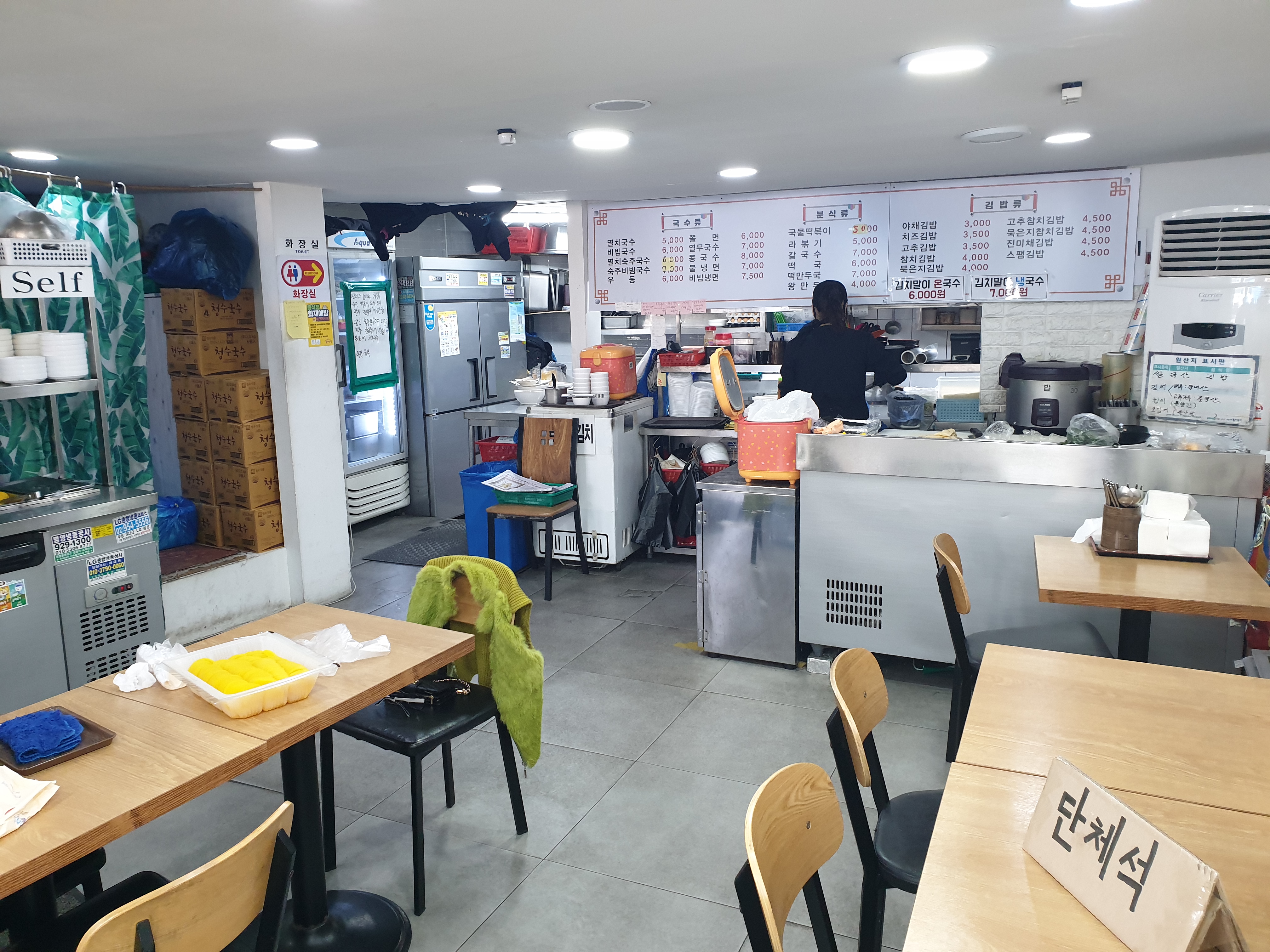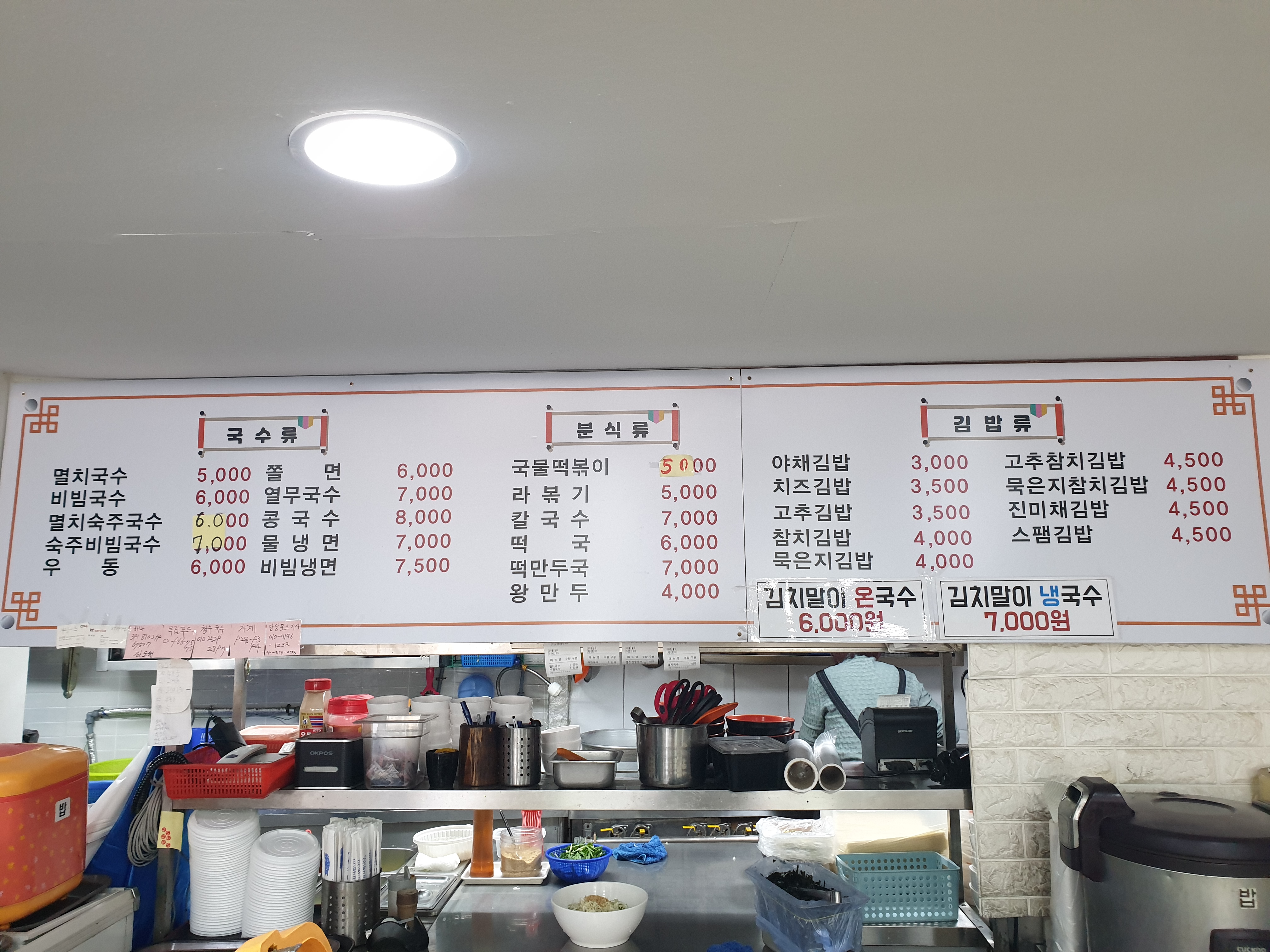 메뉴와 가격표입니다. 멸치국수가 5,000원이면 싼 편이죠. 메뉴는 다양한 편이었고 가격도 저렴했습니다. 배가 출출할 때 부담없이 한끼 먹을 수 있는 고마운 식당입니다. 주변 사람들을 둘러보니 떡만두국을 많이 먹더군요. 저도 다음에는 떡만두국을 시켜먹어 보려구요. 계산은 선불입니다.