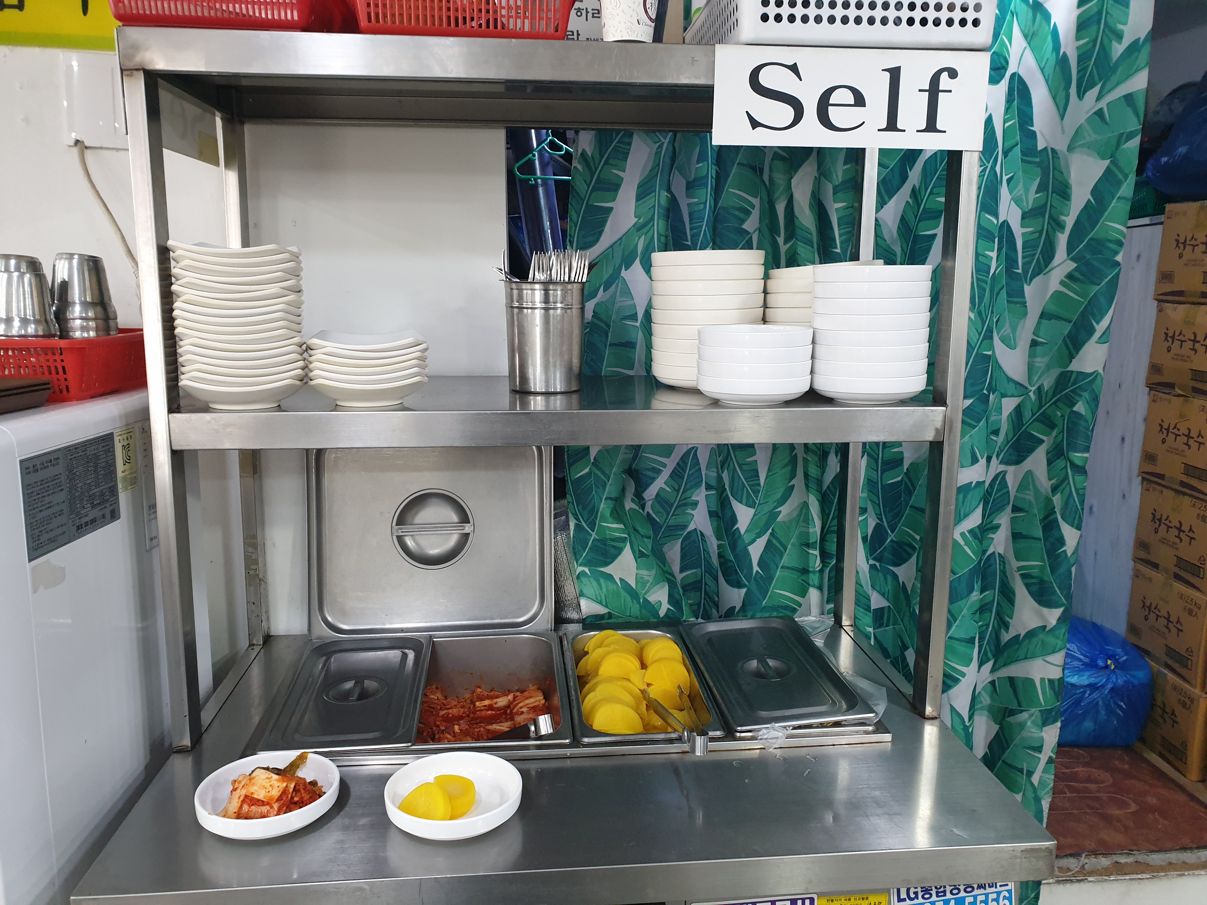 물과 반찬은 셀프입니다. 그냥 자리에 앉아 있었더니 아주머니께서 반찬은 셀프라고 하시네요. 반찬 종류는 김치와 단무지인데 국내산이고 잘 익어 맛도 좋았습니다.