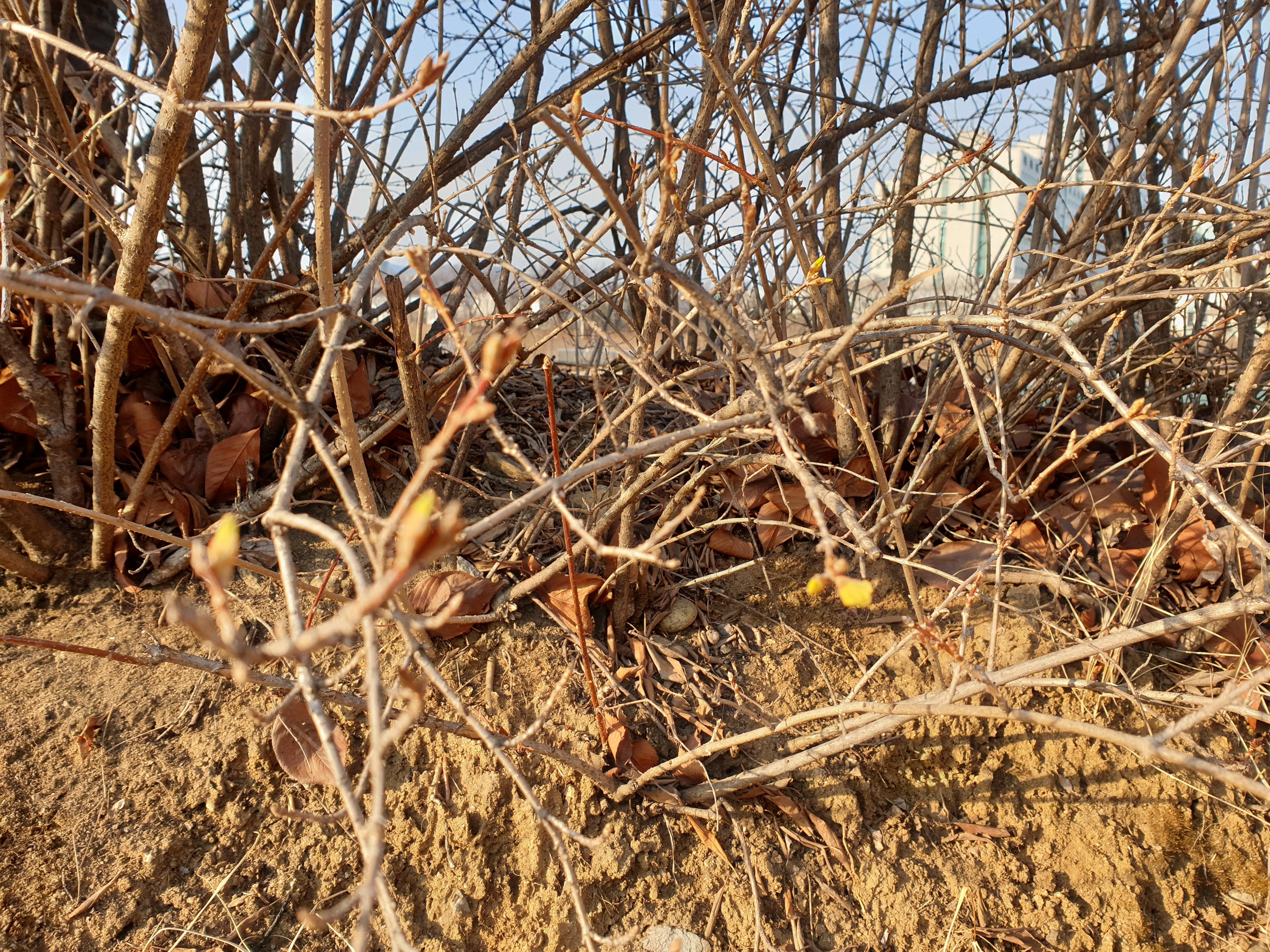 사진에서 잘 보이지 않는데 개나리 꽃망울이 노랗게 맺힌 모습을 찍었습니다. 아직은 날씨가 춥지만 자연은 조용히, 부지런히 봄을 맞이하고 있습니다. 어느 순간 팝콘이 튀겨지듯이 노란 개나리 꽃이 흐드러지게 필 날을 기다려봅니다.