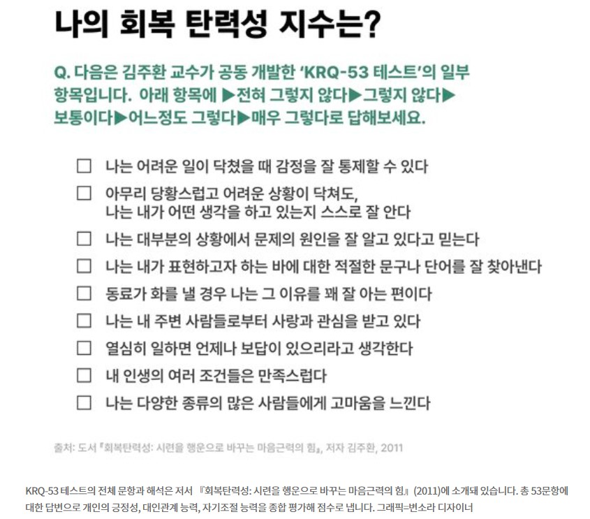 원래 제자리로 돌아오는 힘을 말하며 심리학에서는 시련이나 고난을 이겨내는 긍정적인 힘을 의미합니다. 인생에서 크고 작은 역경은 피할 수 없습니다. 이때 크게 상처 입지 않고 회복할 수 있는 힘을 기르는 게 행복에 이르는 인생의 비결이 됩니다. 운동해서 근육을 단련하듯 긍정적인 정서도 단련해서 습관으로 만들 수 있습니다.