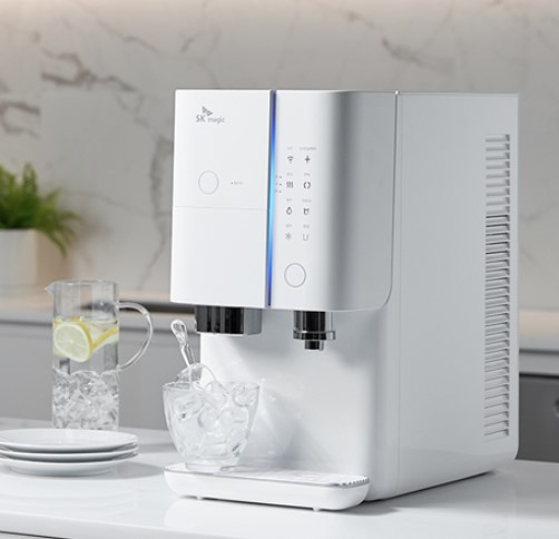 SK매직 all in one 직수 얼음정수기는 정수된 물을 저수조 탱크에 담아 보관하는 '탱크형'방식이 아닌 사용자의 필요에 따라 물을 바로 정수해 제공해 주는 '직수형'방식으로 냉수 온수, 정수, 조리수는 기본, 얼음까지 한 번에 제공합니다.
