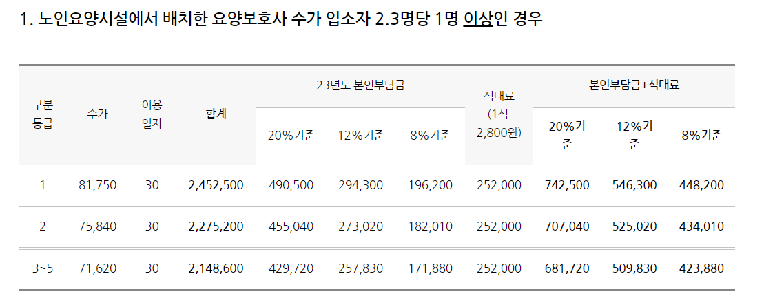 2023년 1월 1일 자로 시설 장기요양보험 수가가 4.54% 인상됨에 따라 본인부담금 납부액이 변경되었습니다. 시설급여는 노인의료복지 시설 인력배치 기준 개선에 따라 구분되어 본인부담금이 부과됩니다. 또한 요양시설 계약의사 진찰비용 본인부담금액도 인상되어 부과될 예정입니다. 어르신의 식비는 2023년도에도 2,800원으로 동일하게 적용됩니다.