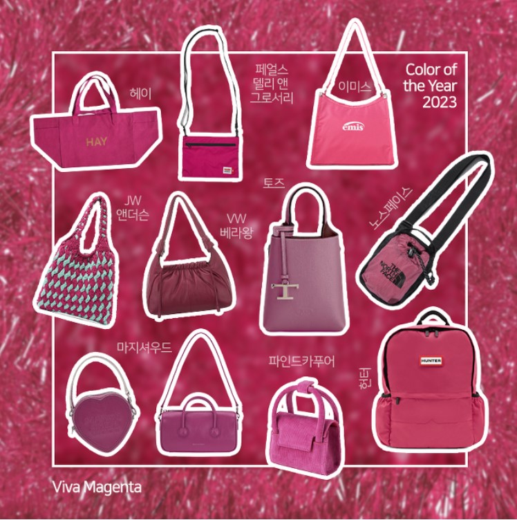 비바 마젠타 컬러 백은 단조로운 패션에 포인트로 제격입니다. 노스페이스의 힙한 크로스 백부터 마지셔우드의 키치 한 하트 백, 베라왕의 고급스러운 토트백까지 다양한 무드로 준비되어 있습니다.
