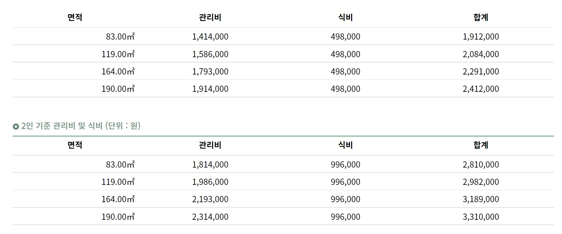 ⊙2인 입주 시 시설운영관리비 400,000만 원, 식대 450,000만 원 추가됨(60끼 의무식/ 2인 입주 시 총 850,000원 추가)