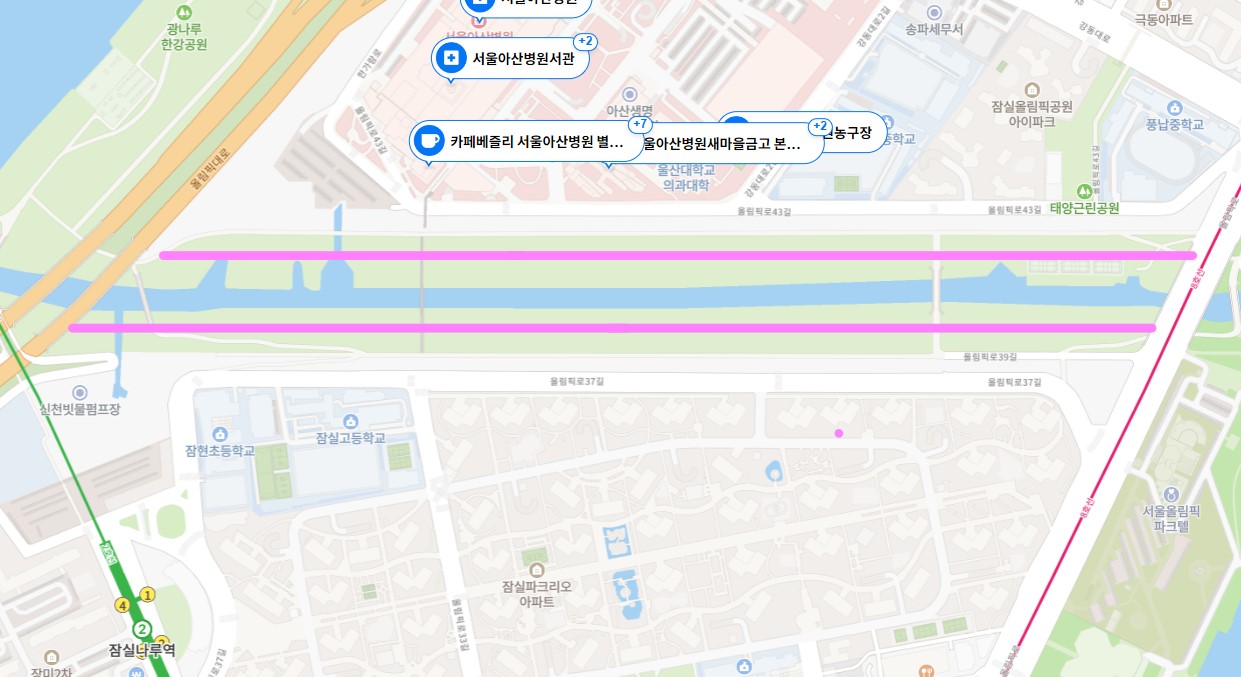 의외로 이곳을 잘 모르고 벚꽃 구경하려 올림픽 공원이나 사람이 많은 석촌 호수로 가는 사람이 많습니다. 잠실 나루역 1번 출구로 나와 아산병원 가는 길에 있는 분홍색으로 표시된 곳이 서울 벚꽃 명소입니다.