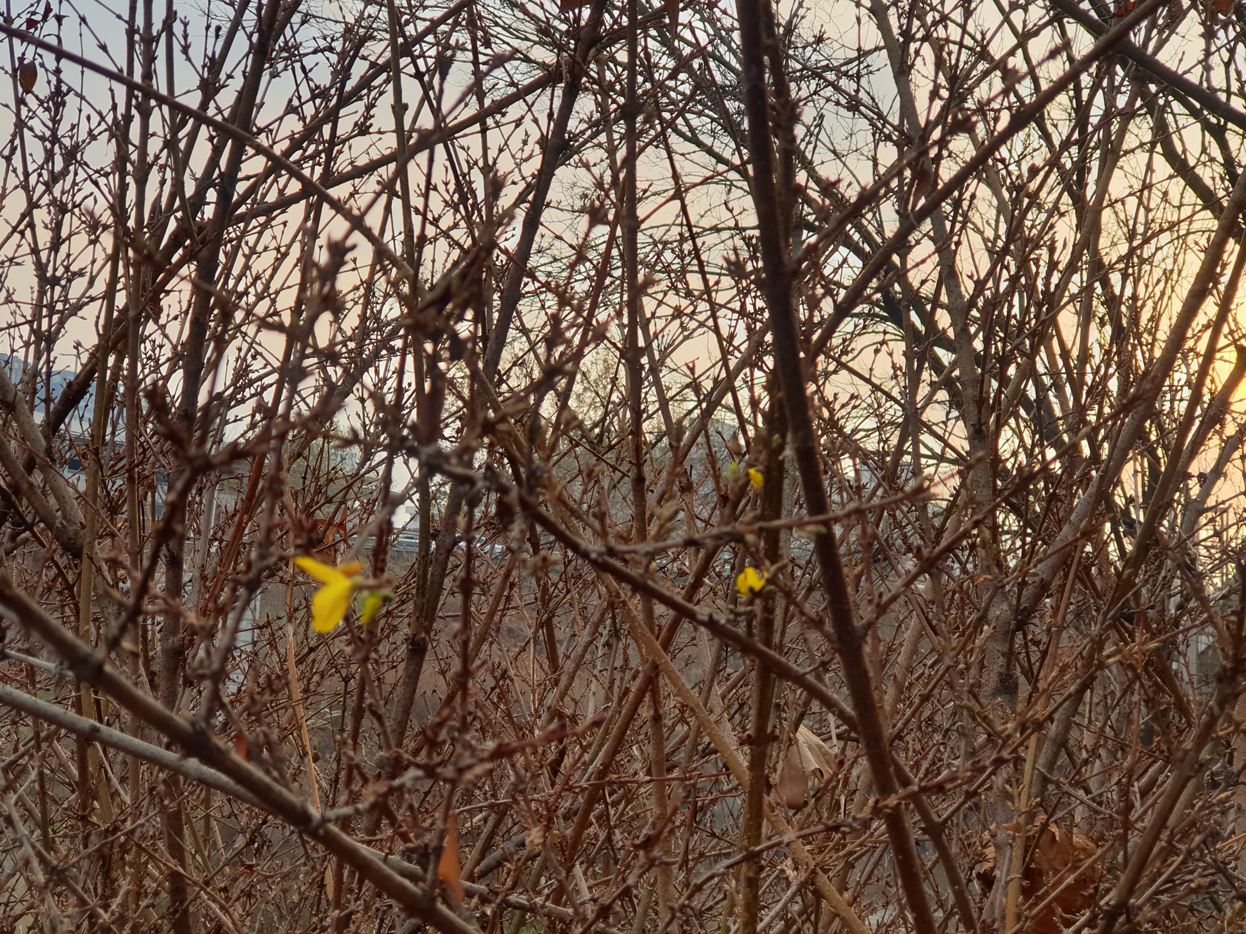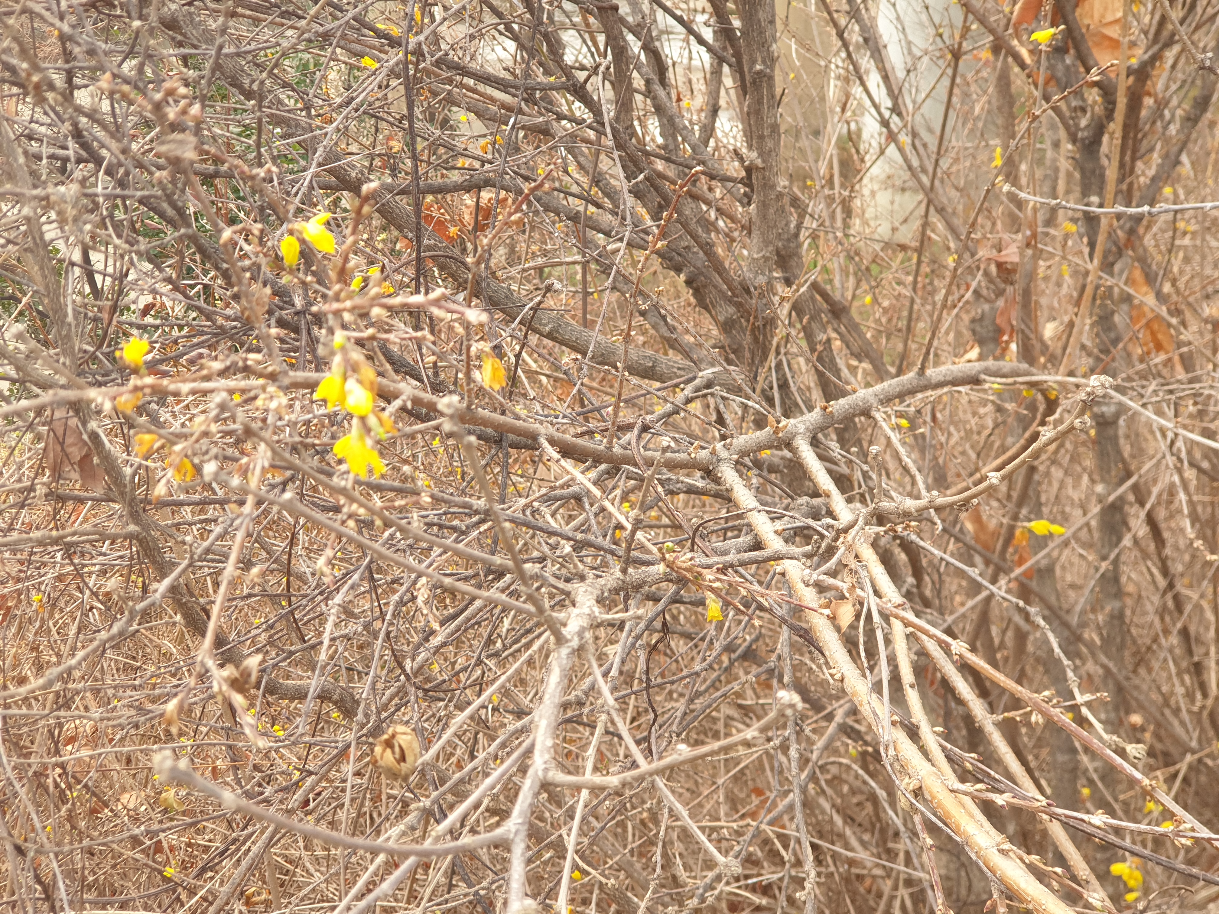 운동을 하다가 앙상한 나뭇가지 사이로 노란 몽우리를 봤습니다.