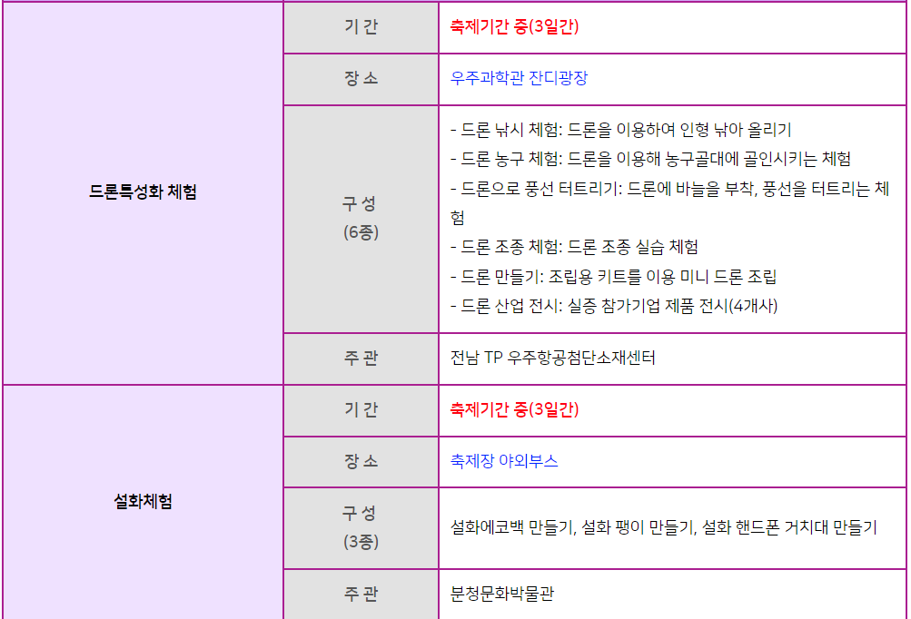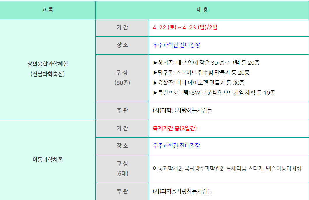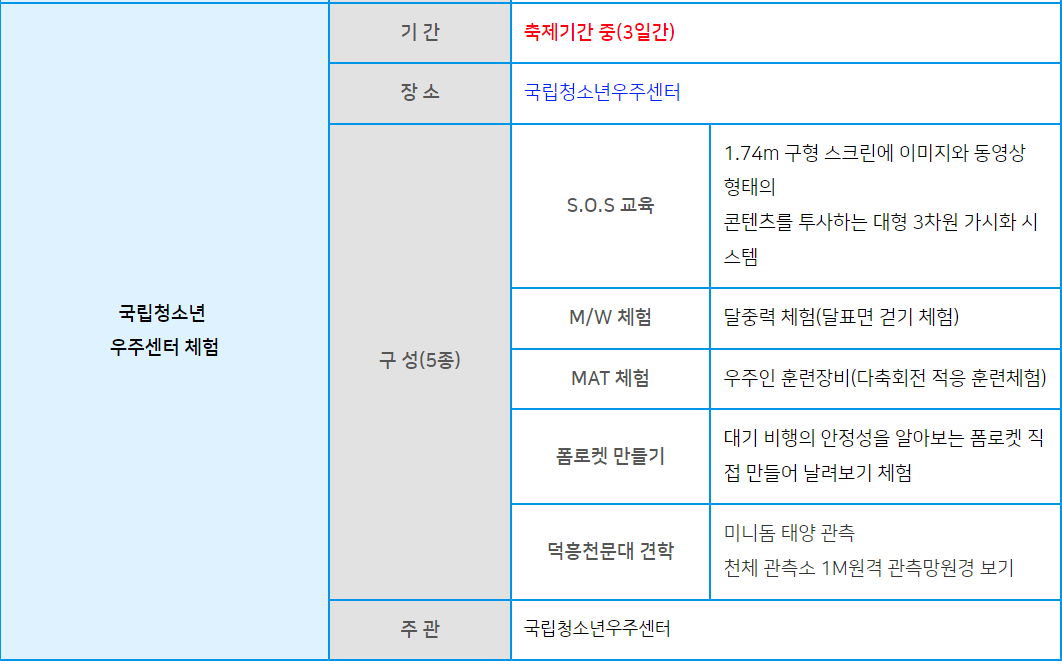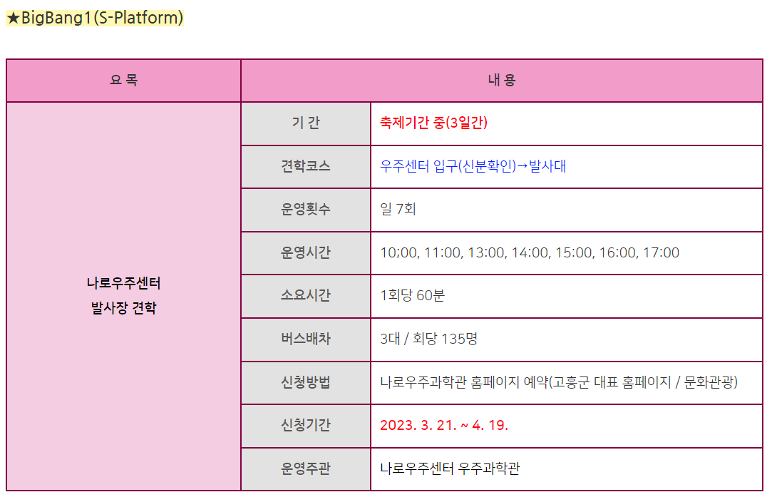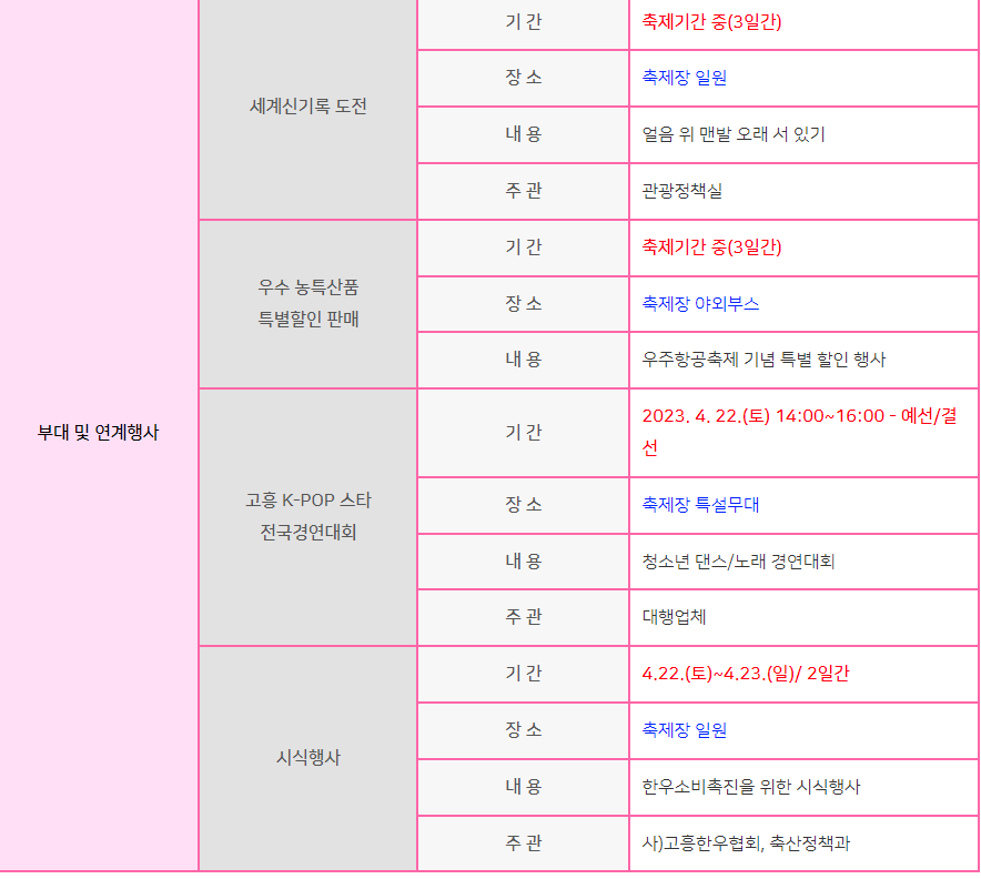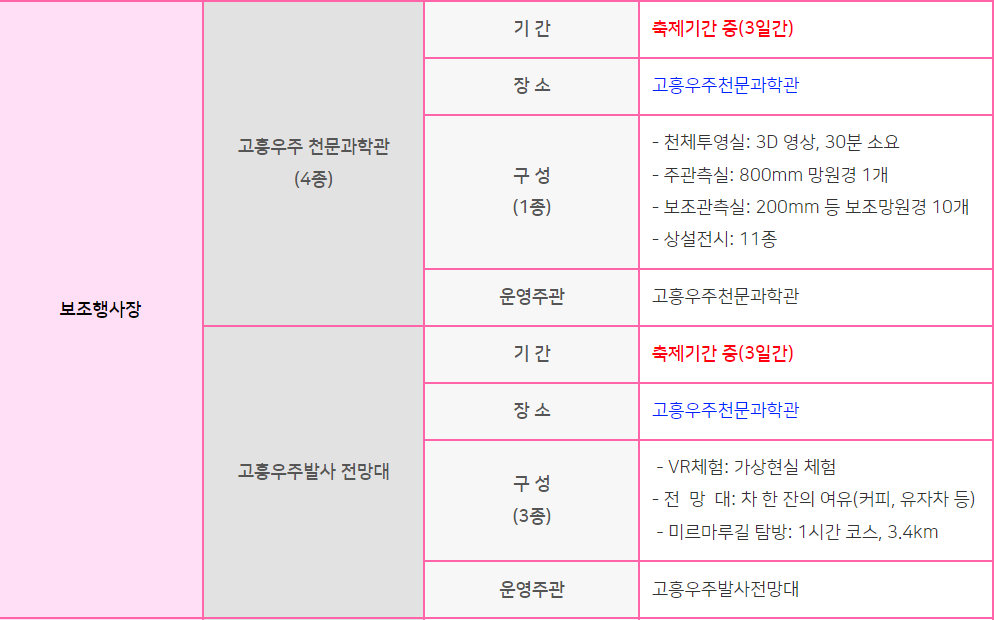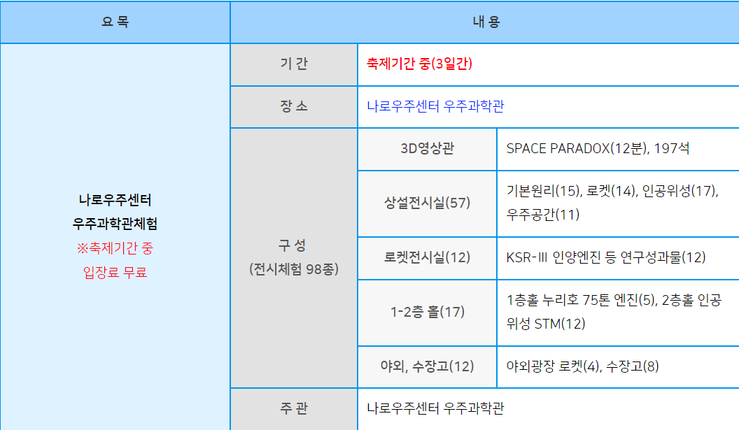 행사장소는 나로우주센터 일원에서 열리고 주체는 고흥축제추진위원회입니다. 나로우주발사센터현장 견학, 우주과학관 관련 200여 종 프로그램 무료체험, 청소년 댄스 등 흥미로운 행사들이 준비되었습니다.