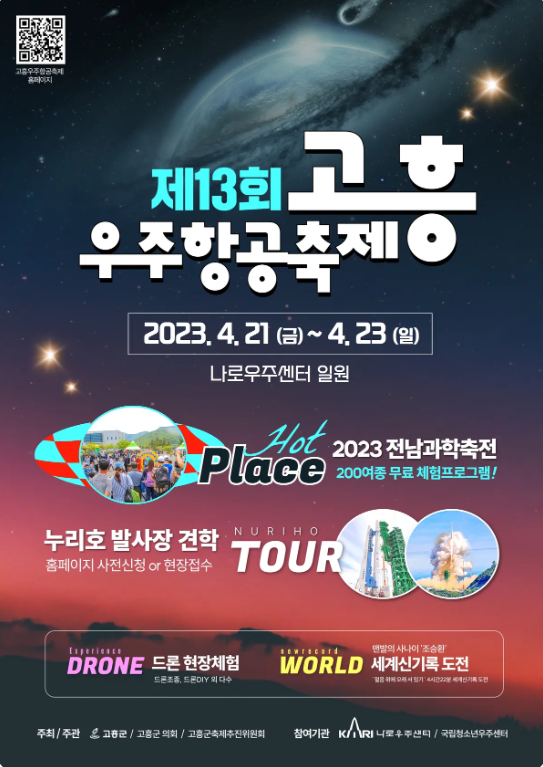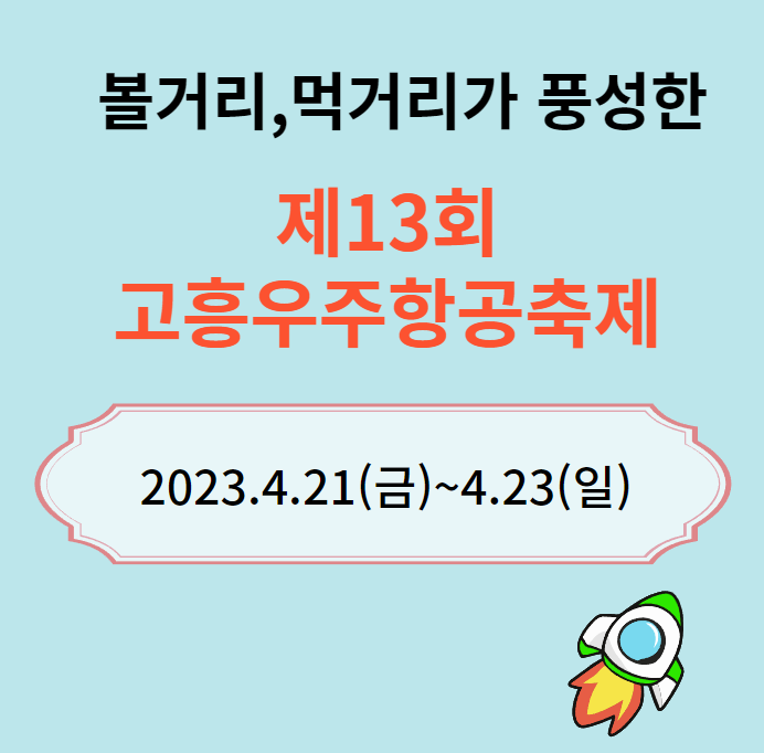 올해로 13회째를 맞는 고흥우주항공축제는 오는 2023.04.21~04.23일까지 개최됩니다. '별난 우주여행 웰컴투 고흥'이라는 주제로 200여 가지 프로그램을 체험할 수 있는 과학체험축제 형식으로 열리는데요. 가족들과 함께 축제 참여 겸 여행으로 다녀오기 좋은 곳이라 생각해서 고흥우주항공축제 행사기간, 프로그램, 행사일정에 대해 자세히 소개해보도록 하겠습니다.