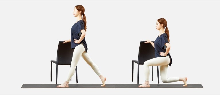 의자런지는 무산소 운동 중에서 무릎의 부담 없이 엉덩이와 허벅지의 근육을 키워주는 운동입니다.