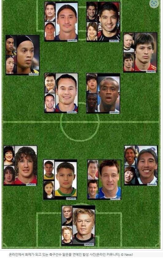 먼저 공격을 이끌고 있는 즐라탄 이브라히모비치와 루이스 수아레즈는 각각 영화배우 신현준과 미스에이 수지와 합성돼 있습니다. 좌우측 미드필더 호나우딩요와 다비드 실바는 티아라 은정과 영화배우 정재영, 중앙 미드필더 이니에스타와 야야 투레는 양현석, 김구라의 아들 동현 군과 비슷한 얼굴입니다. 마지막 수비라인 포백의 카를레스 푸욜과 티아고 실바, 존 테리, 세르히오 라모스는 각각 가수 노사연, 아역배우 김유정, 배우 김병세, 개그맨 양상국 등의 얼굴과 합성돼 있습니다. 골키퍼 자리에 위치한 독일대표팀 출신 올리버 칸은 가수 박진영과 닮은꼴입니다. 축구선수 닮은꼴 합성 사진을 본 누리꾼들은 "저 멤버로 챔피언스리그 나가면 최소한 4강이겠네.", "신현준이랑 즐라탄은 국가적 차원에서 한 번 만나게 해줘야 하는데"등의 반응을 보였습니다.