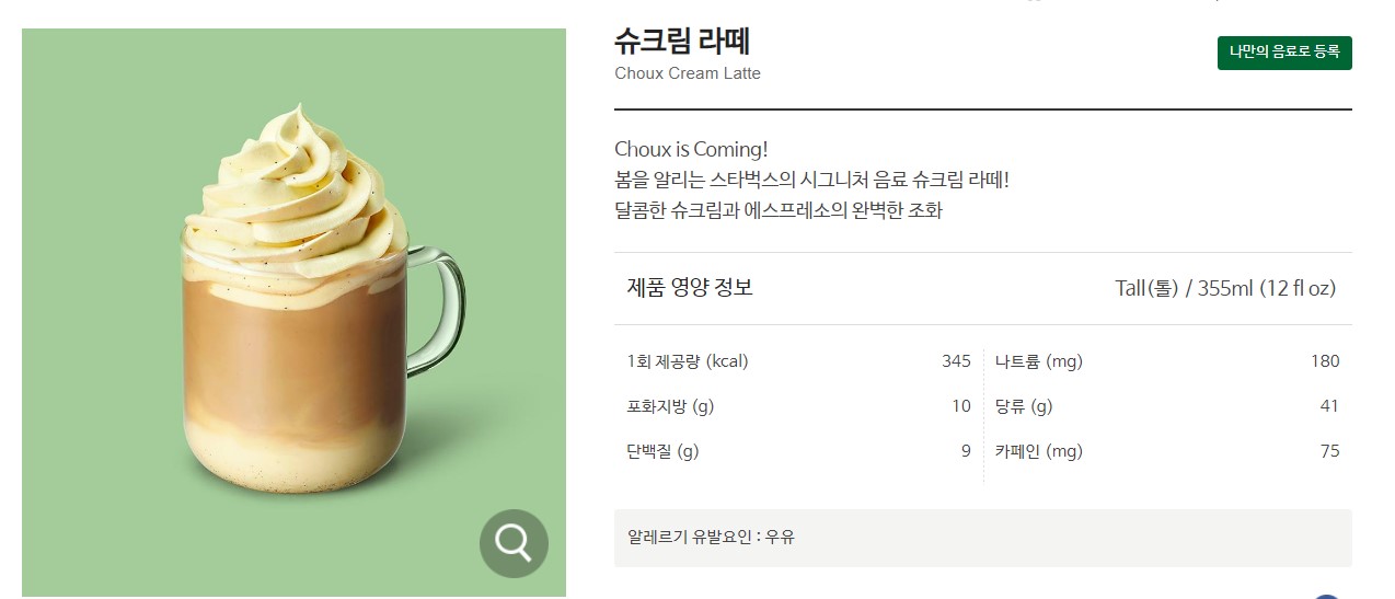슈크림 라떼 영양성분(칼로리)