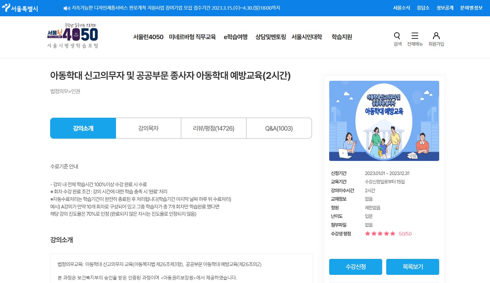 서울시평생학습포털에서는 아동학대신고자 의무교육을 2023.1010~20203.12.31일까지 온라인에서 진행합니다. 회원가입을 하시고 수강신청을 하시면 누구나 강의를 들을 수 있습니다.