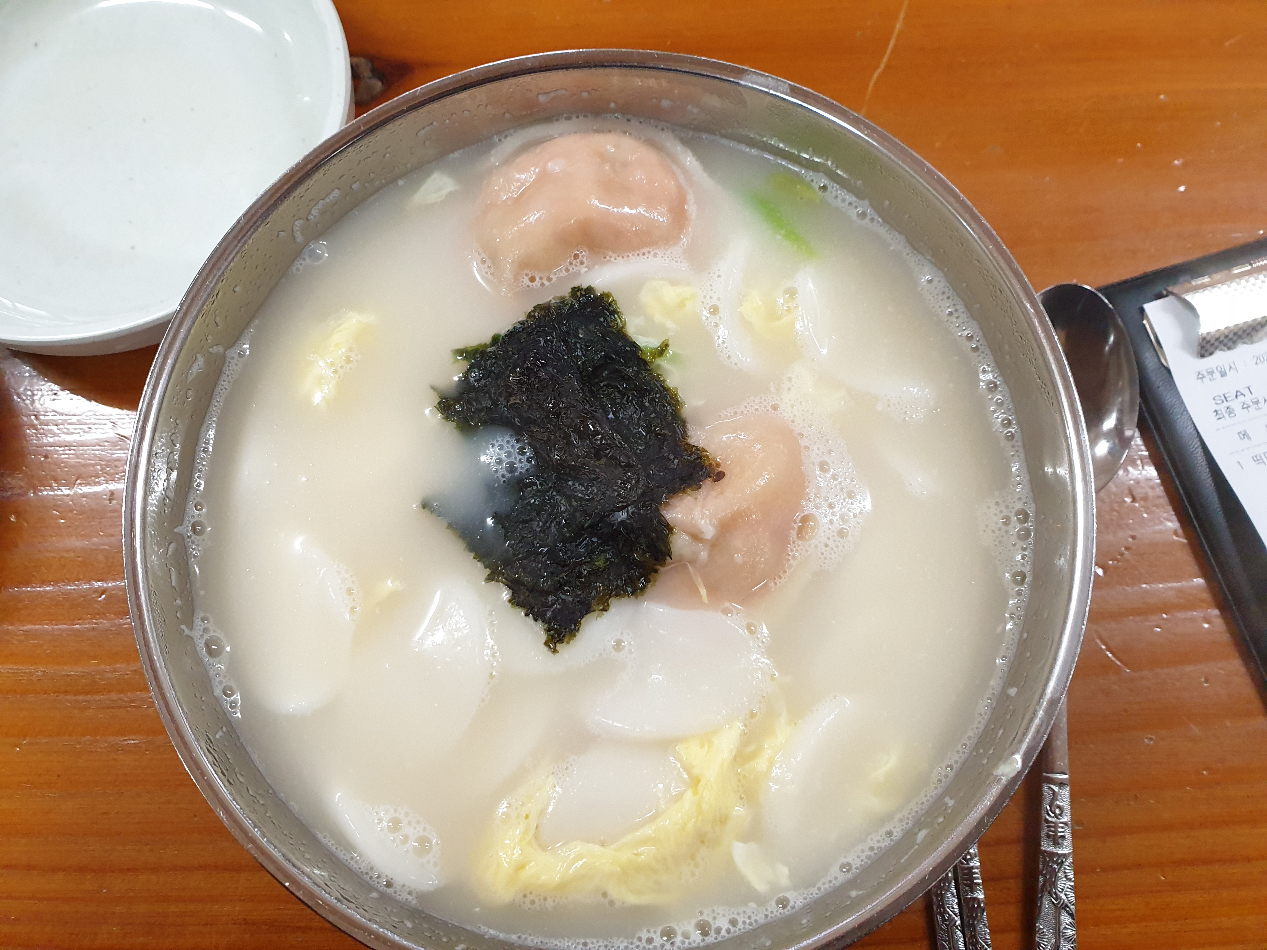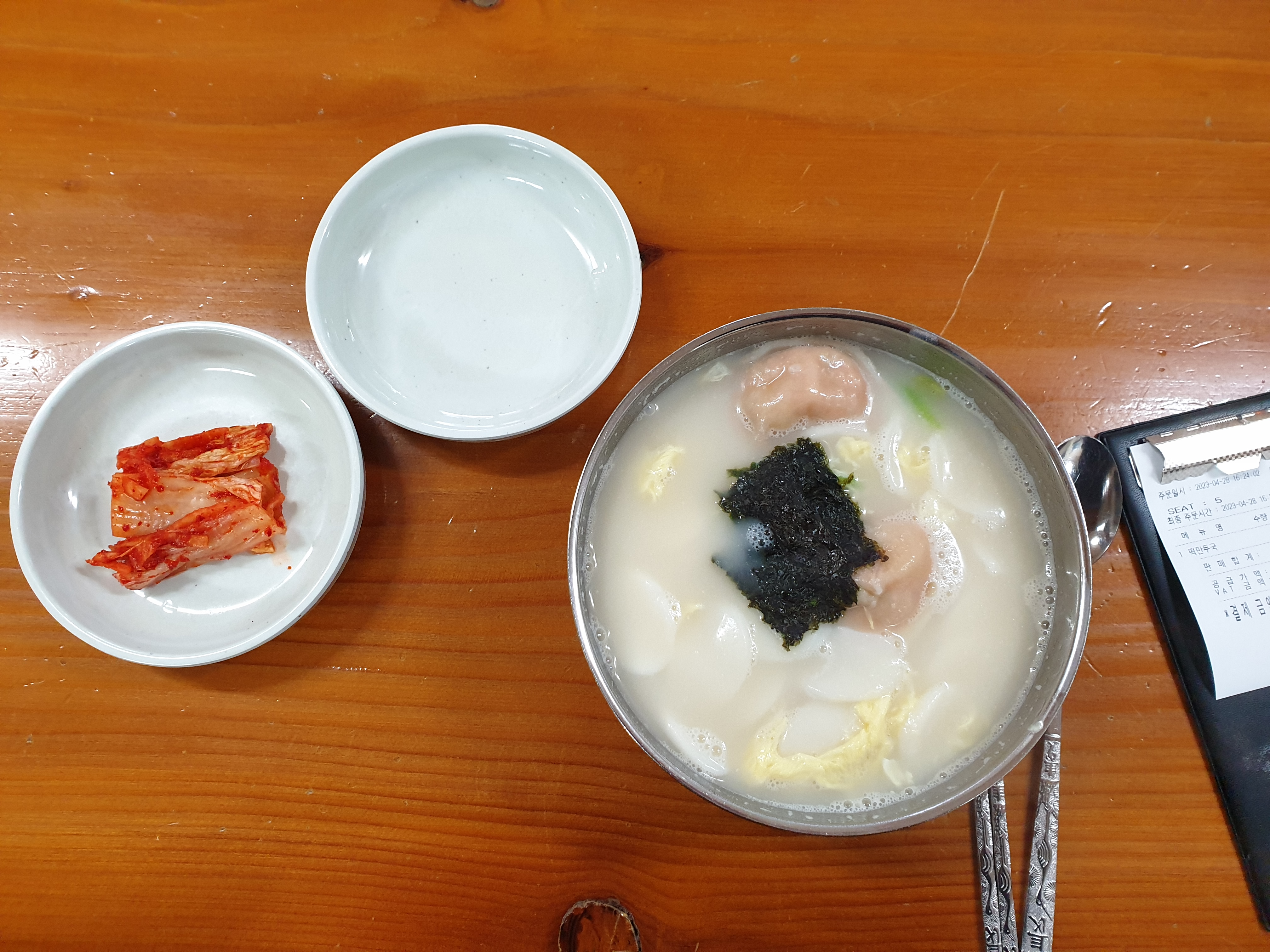 제가 주문한 떡만둣국입니다. 진한 사골육수에 만두 5개, 쫄깃한 떡국이 가득 들어 있습니다. 결국 떡국은 다 먹지를 못했습니다. 만두소를 보면 숙성된 김치가 가득 들어 있습니다. 조미료 맛이 아니라 엄마가 겨울에 김장 김치로 해주시던 만두 맛입니다.