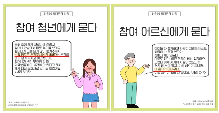 참여 대학생은 '벅찰 정도로 챙겨주셔서 감사하다'라고 할머니의 정을 느껴서 좋았다고 하고 참여 어르신은 경제적인 효과뿐만 아니라 정서적 안정감을 주는 효과가 있다고 하셨습니다. 낯선 사람끼리 한 공간에 산다는 것이 불편할 수 있지만 노장청 세대 공감으로 서로 존재하는 사실만으로 의지가 된다고 합니다.