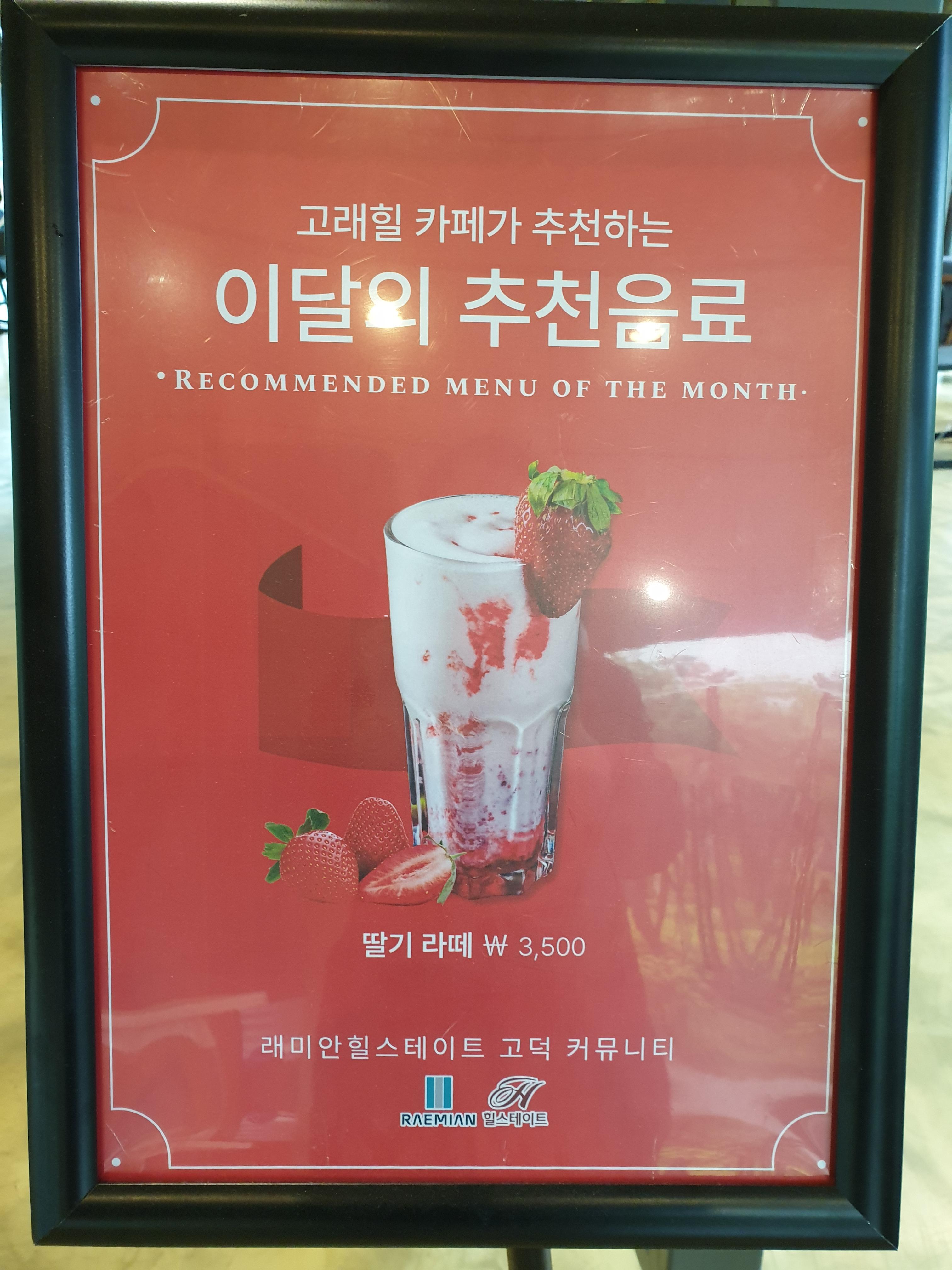 이달의 추천메뉴로 딸기 라떼가 3,500원이라니 완전 가성비 갑입니다. 카페의 가장 중요한 원두도 입주민들의 시음을 거쳐 선정하고 있네요.