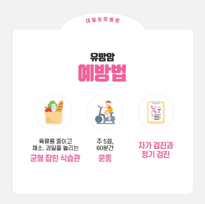 유방암을 예방법은 건강생활 습관을 기르는 방법과 같습니다. 먼저 육류를 줄이고 채소, 과일을 늘리는 균형 잡힌 식습관을 유지하고 이와 함께 일주일에 5회 이상 60분간 운동을 하면 유방암 발병률을 낮추는데 큰 도움이 됩니다. 음주는 유방암의 원인이 되는 여성호르몬수치를 높이기 때문에 가급적 하지 않는 것이 좋고 살이 찌지 않도록 주의해야 합니다.