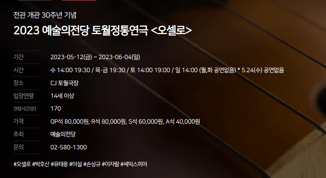 예술의 전당에서는 개관 30주년을 맞아 '토월정통연극'을 선보입니다. 토월정통연극은 고전의 재발견을 가치로 내건 예술의 전당 제작 연극 프로그램으로 올해는 셰익스피어의 희곡 중 4대 비극 햄릿, 오셀로, 맥베스, 리어왕 중에 하나인 '오셀로'를 공연합니다.