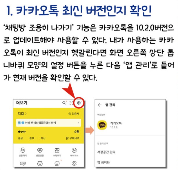 '채팅방 조용히 나가기' 기능은 카카오톡을 10.2.0 버전으로 업데이트해야 사용할 수 있습니다. 내가 사용하는 카카오톡이 최신 버전인지 헷갈린다면 화면 오른쪽 상단 톱니바퀴 모양의 설정버튼을 누른 다음 '앱 관리'로 들어가 현재 버전을 확인하시면 됩니다.