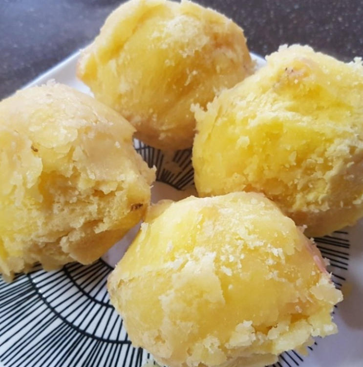8. 보슬보슬 카스텔라처럼 익은 홍감자를 김치나 소금, 설탕을 곁들여 맛있게 드세요.