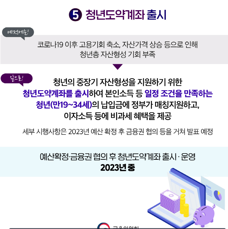 2023년 금융위원회서 청년 도약 계좌를 신설했습니다. 청년도약계좌는 공약으로 나왔던 당시에는 10년간 목돈 1억원 만들기 내용이었습니다. 하지만 2023년 출시 확정된 청년도약계좌는 5년간 목독 5,000만원을 마련하기로 바뀌었습니다. 기존 '청년희망적금'은 폐지하고 상품을 확대 개편하여 2023 '청년도약계좌'를 출시했는데요. 기존 청년희망적금 가입자와 중복 가입 및 갈아타기 여부는 아직 협의 중인 상태라고 합니다.