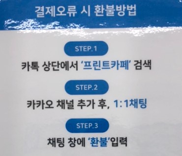 무인카페여서 즉각적인 도움을 받을 수 없다는 단점이 있습니다. 결제 오류가 생겼을 때에는 카톡 상단에서 '프린트 카페'를 검색, 채널 추가 후 1:1 채팅 창에 '환불'이라고 입력하면 됩니다.