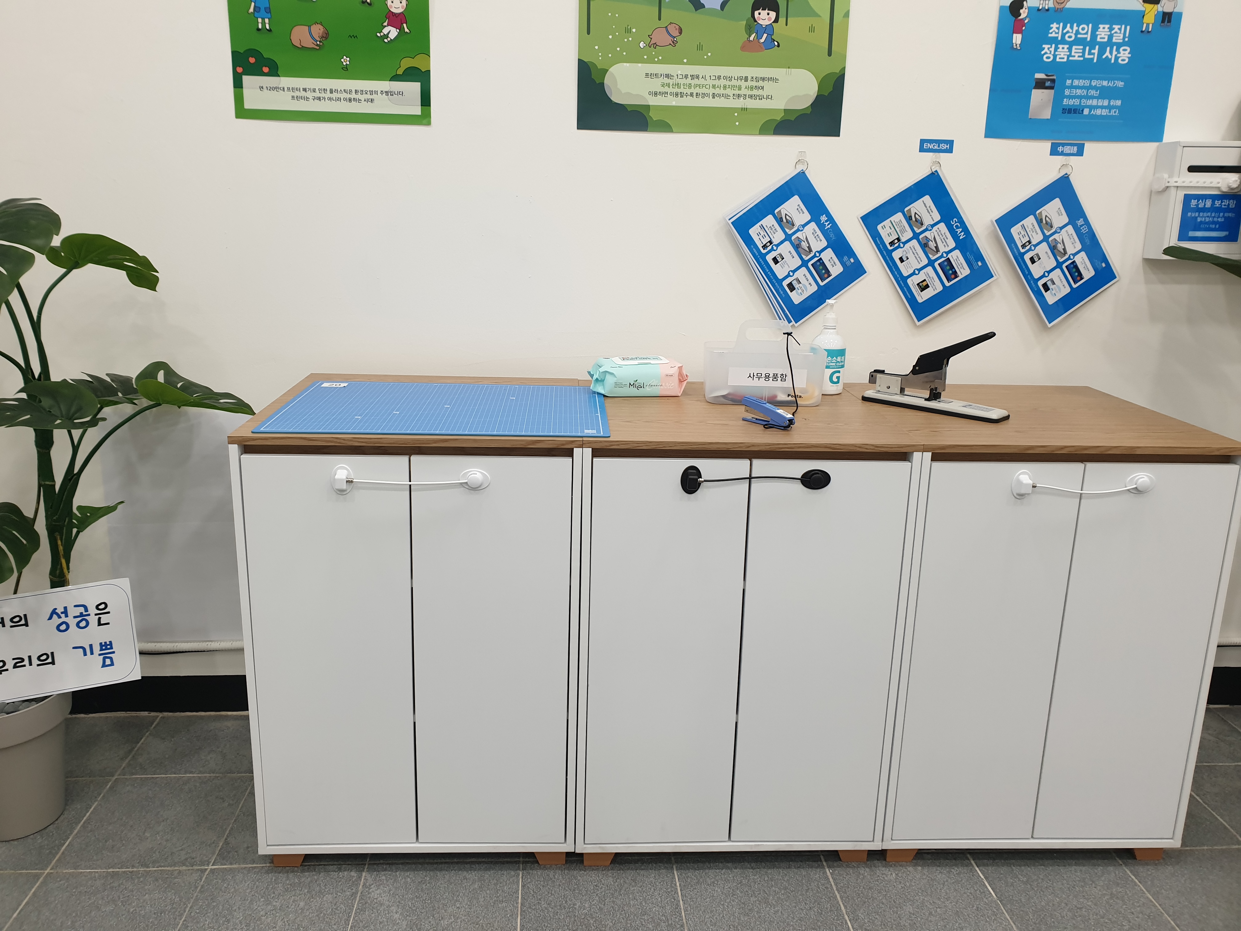 소독제, 물티슈가 구비되어 있어 위생적으로 보였습니다. 스테이플러도 종류별로 있어 인쇄물 양이 많아도 잘 처리할 수 있습니다. 간단한 사무용품들이 있으니 사용하시면 됩니다.