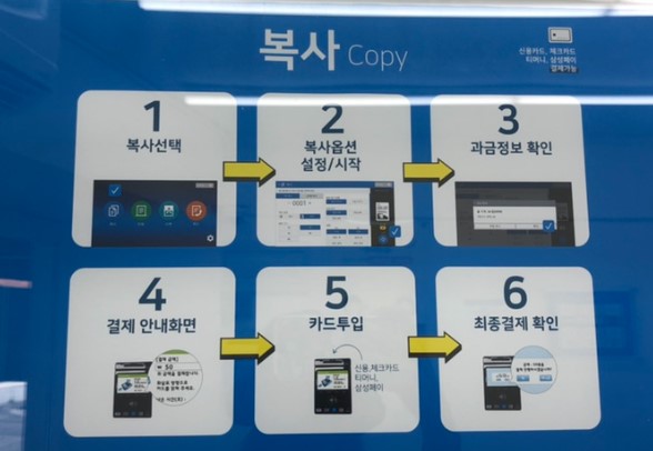 프린트에 있는 복사를 선택, 복사 옵션을 설정합니다. 그리고 카드로 결제를 하면 복사를 할 수 있습니다. 비교적 방법은 간단합니다. 마트에서 무인 결제하는 방법과 비슷해 보입니다.