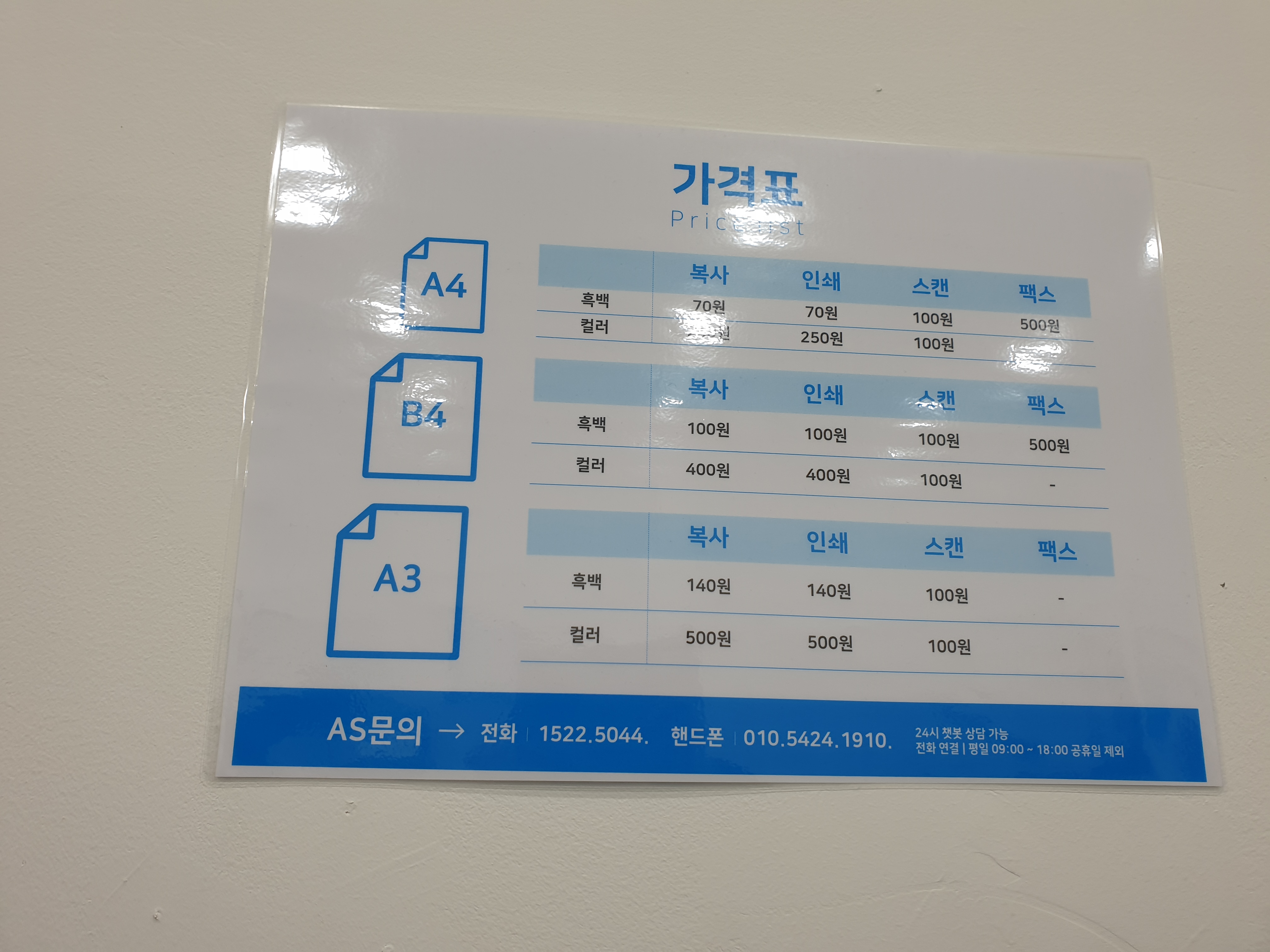 -B4흑백 복사, 인쇄 100원, 스캔 100원, 팩스 500원입니다. 컬러는 복사, 인쇄 400원, 스캔 100원