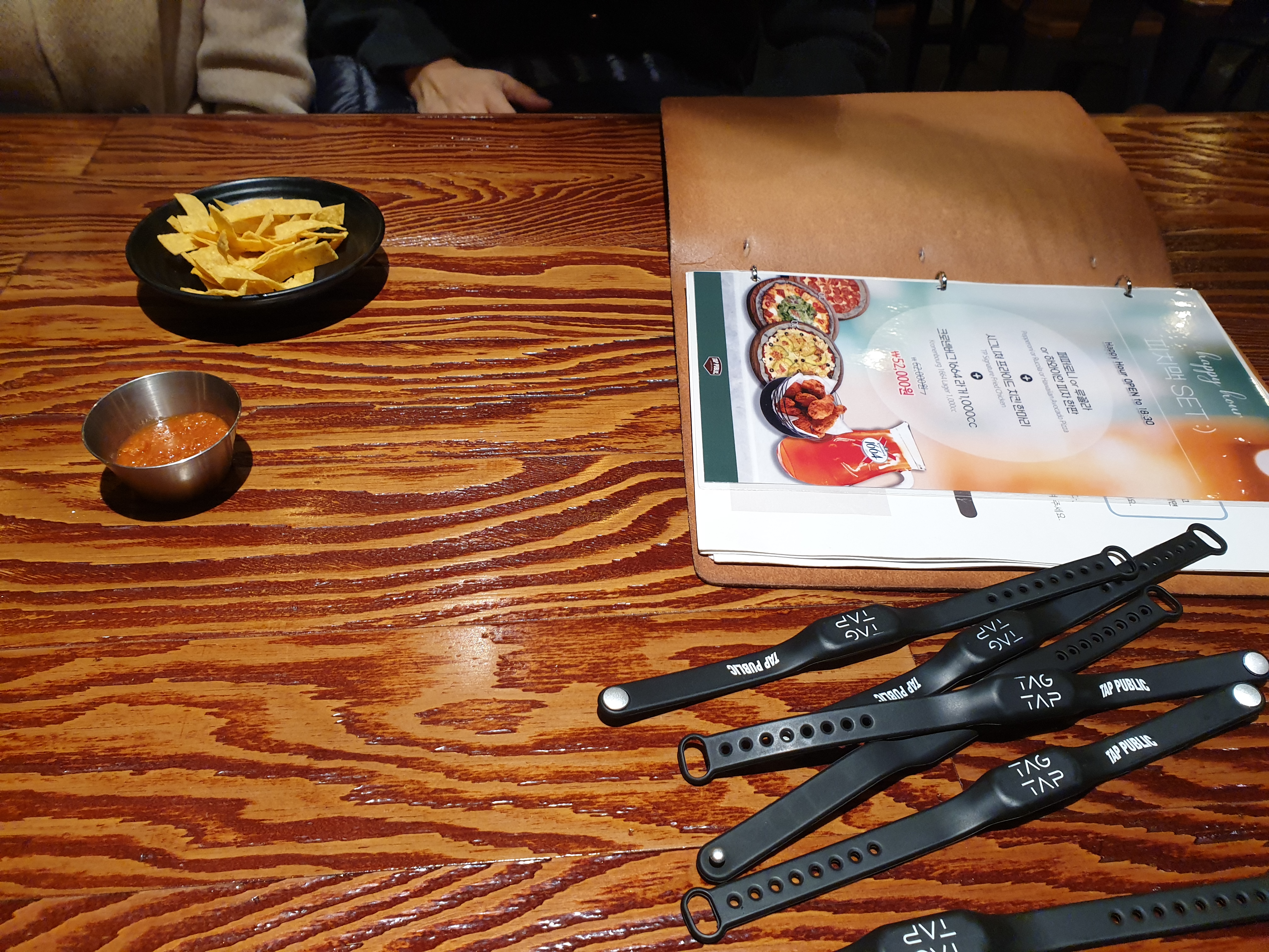 처음에 자리에 앉으면 나쵸와 탭을 인원수만큼 세팅해줍니다. 워터 파크에서만 봤던 탭을 맥주집에서 보다니 신기합니다.