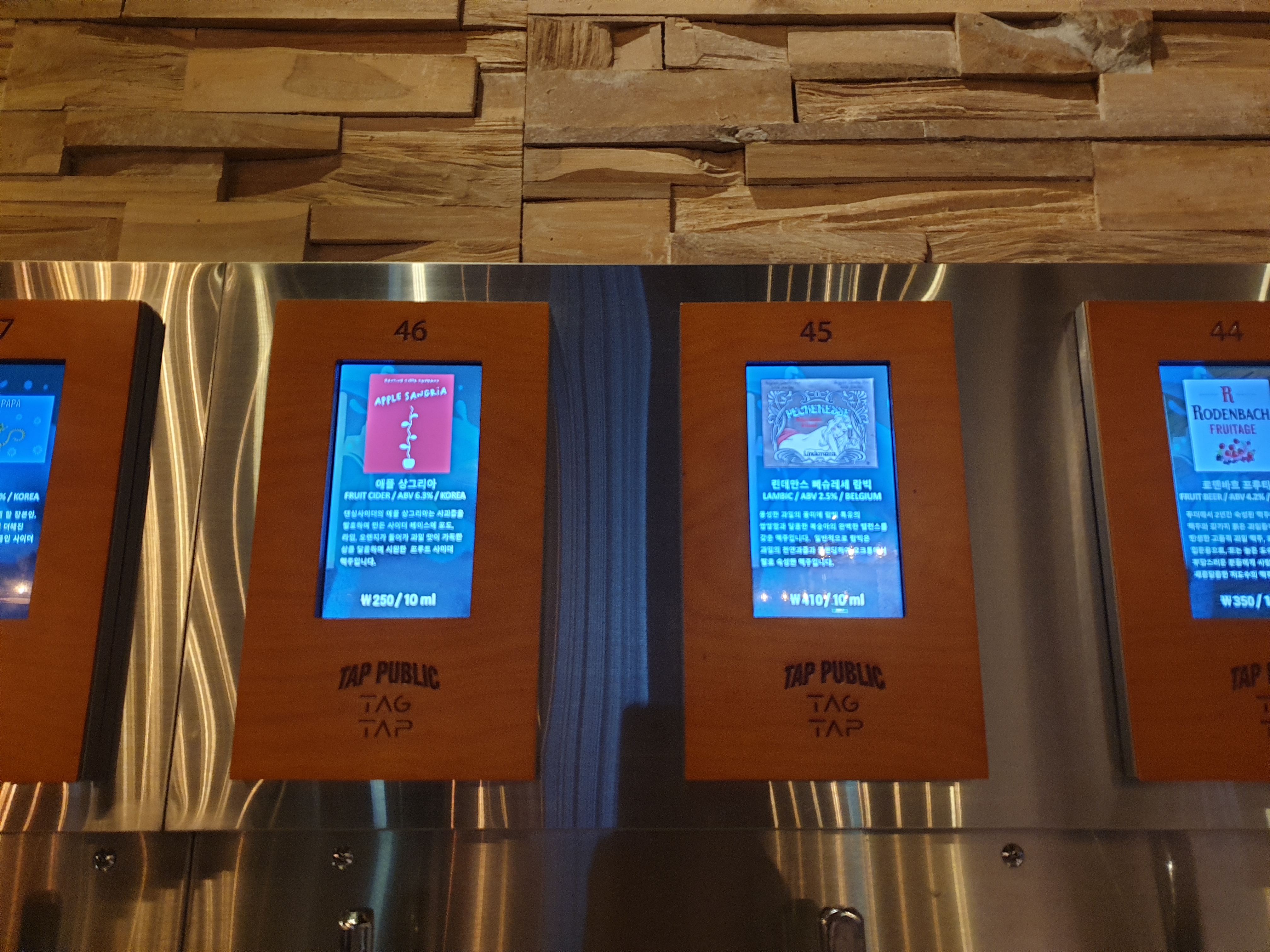 이용방법은 처음에 잔을 선택한 후 세척기에 올려 헹궈줍니다. 그런데 세팅되어 있는 잔들이 깨끗해서 굳이 세척할 필요는 없습니다. 원하는 맥주를 선택한 후 팔찌를 맥주 스크린 하단에 'TAG TAP'이란 부분에 대면 '삐' 소리가 납니다. 삐 소리가 나지 않으면 맥주를 따를 수 없습니다. 잔을 기울이고 원하는 만큼 맥주를 따릅니다. 이때 화면에 내가 따르고 있는 맥주의 양과 금액이 표시됩니다.