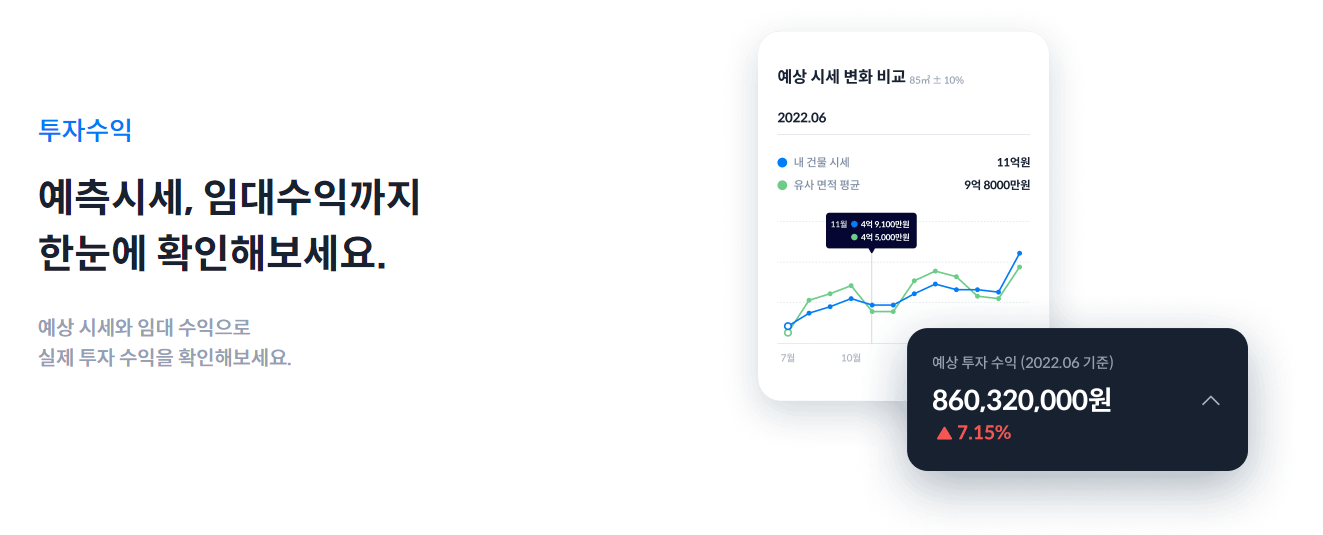 예상 시세와 임대 수익으로 실제 투자 수익을 달마다 확인할 수 있어 자산의 변동성을 쉽게 파악할 수 있습니다. 자신의 물건이지만 매번 시세를 파악하지 않는 이상 총 자산 규모와 수익률을 측정하기는 어렵습니다. 홈노크에서는 그러한 문제점을 해결하기 위해 달마다 예측시세, 임대수익까지 한눈에 볼 수 있도록 정보를 제공하고 있습니다.