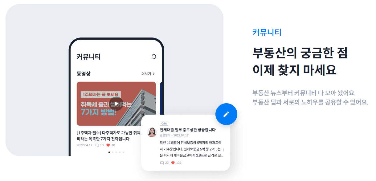 부동산 분야에 전문가의 글을 클릭해서 볼 수 있습니다. 그리고 부동산에 대한 실시간 뉴스부터 커뮤니티를 다 모아 서로 팁과 서로의 노하우를 공유할 수 있습니다.