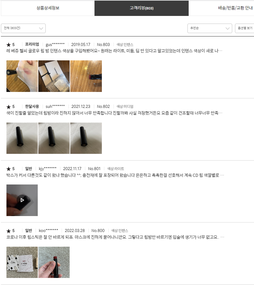 고객리뷰 803건 내용 대부분이 만족하는 내용이었습니다. 데일리 립밤으로 사용하기에 너무 좋다. 색상과 케이스가 너무 마음에 든다. 입술이 건조한 편인데 촉촉해졌다. 은은하고 촉촉한 색이 예쁘다. 향도 부담 없고 발림성이 좋다. 등 후기가 긍정적이었습니다.
