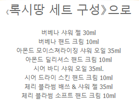 록시땅의 대표적인 제품을 선물 세트로 하였습니다. 샤워젤, 핸드크림, 샤워오일 등 8종으로 다양한 제품을 접해볼 수 있고 개별포장으로 되어 있어 선물하기에 좋은 아이템입니다. 제품 구성으로 아로마콜로지 릴랙싱 배쓰 샤워젤은 에센셜 오일이 들어가 있는 진정효과를 주는 샤워젤입니다. 100% 천연향이고 섬세한 거품은 피부가 건조하지 않고 정돈되는 느낌을 줍니다. 시어버터 바디 샤워오일은 시어버터 농축액이 들어 있어 물과 만나면 부드러운 거품이 생깁니다. 촉촉한 보습막이 생기고 실키한 느낌을 줍니다. 체리블라썸 배쓰 앤 샤워젤은 플라워계열이고 거품도 굉장히 풍성해서 입욕제로도 사용이 가능합니다. 아몬드 모이스처라이징 샤워오일은 달콤한 아몬드 향이 은은하게 오래가서 아로마효과를 줍니다. 4가지 핸드크림은 록시땅 대표 제품으로 거친 손을 촉촉하게 해주는 보습성분이 뛰어납니다.