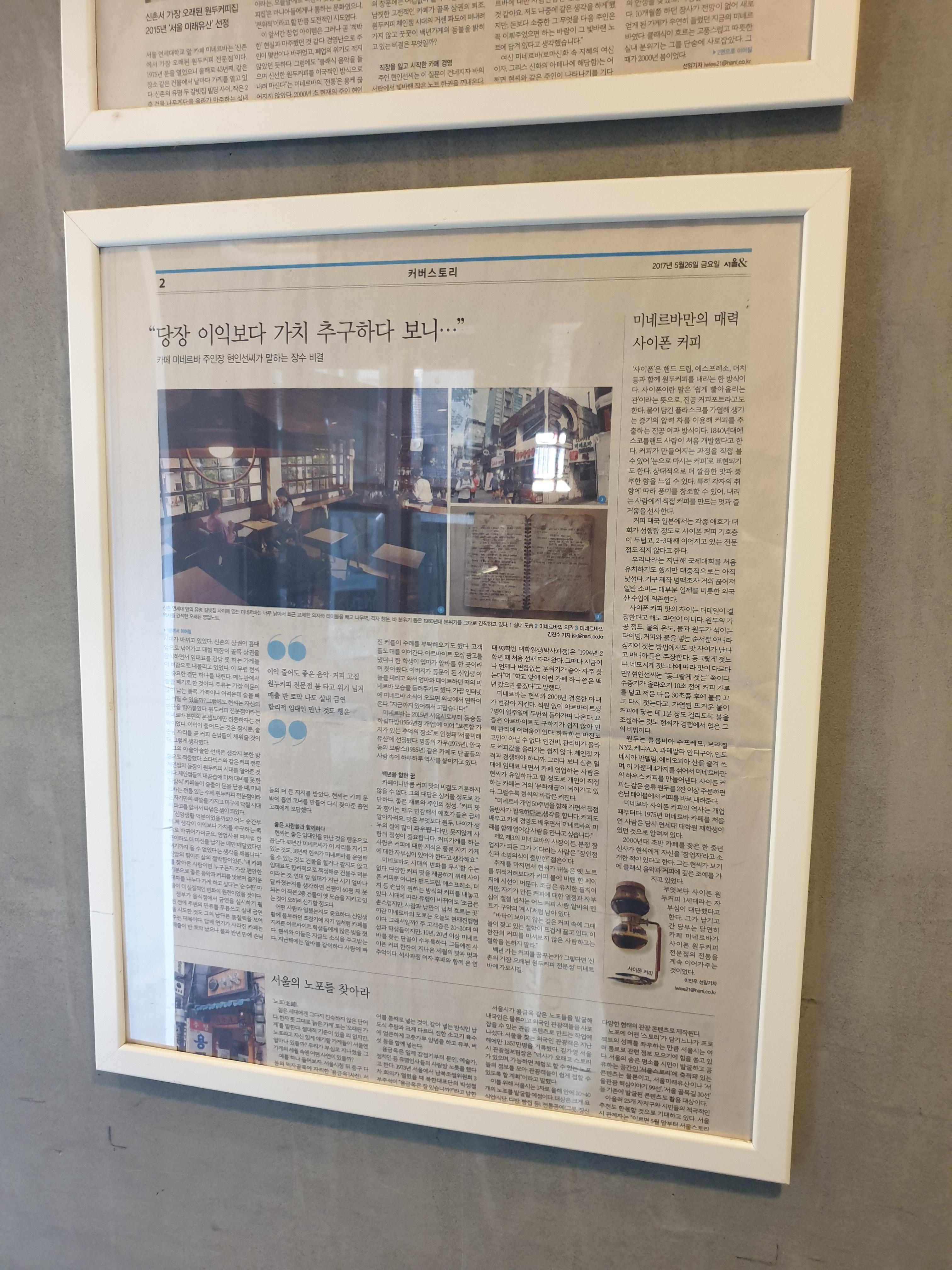 미네르바 입구에 있는 '조금은 촌스럽지만 사랑과 낭만이 넘쳐흐르는 곳'이라는 글씨도 오래되어 빛을 바랐네요. 미네르바 카페에 대한 옛날 기사를 걸어놨습니다. '당장에 이익보다 가치를 추구하다 보니...'참 마음에 드는 문장입니다.