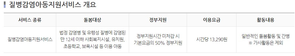 유치원, 초등학교 등 시설 이용 아동이 전염성 및 유행성 질병 감염 등에 의해 불가피하게 가정양육이 필요한 경우 아이돌보미가 돌봄 장소에 직접 찾아가 돌봄을 제공하는 서비스입니다.
